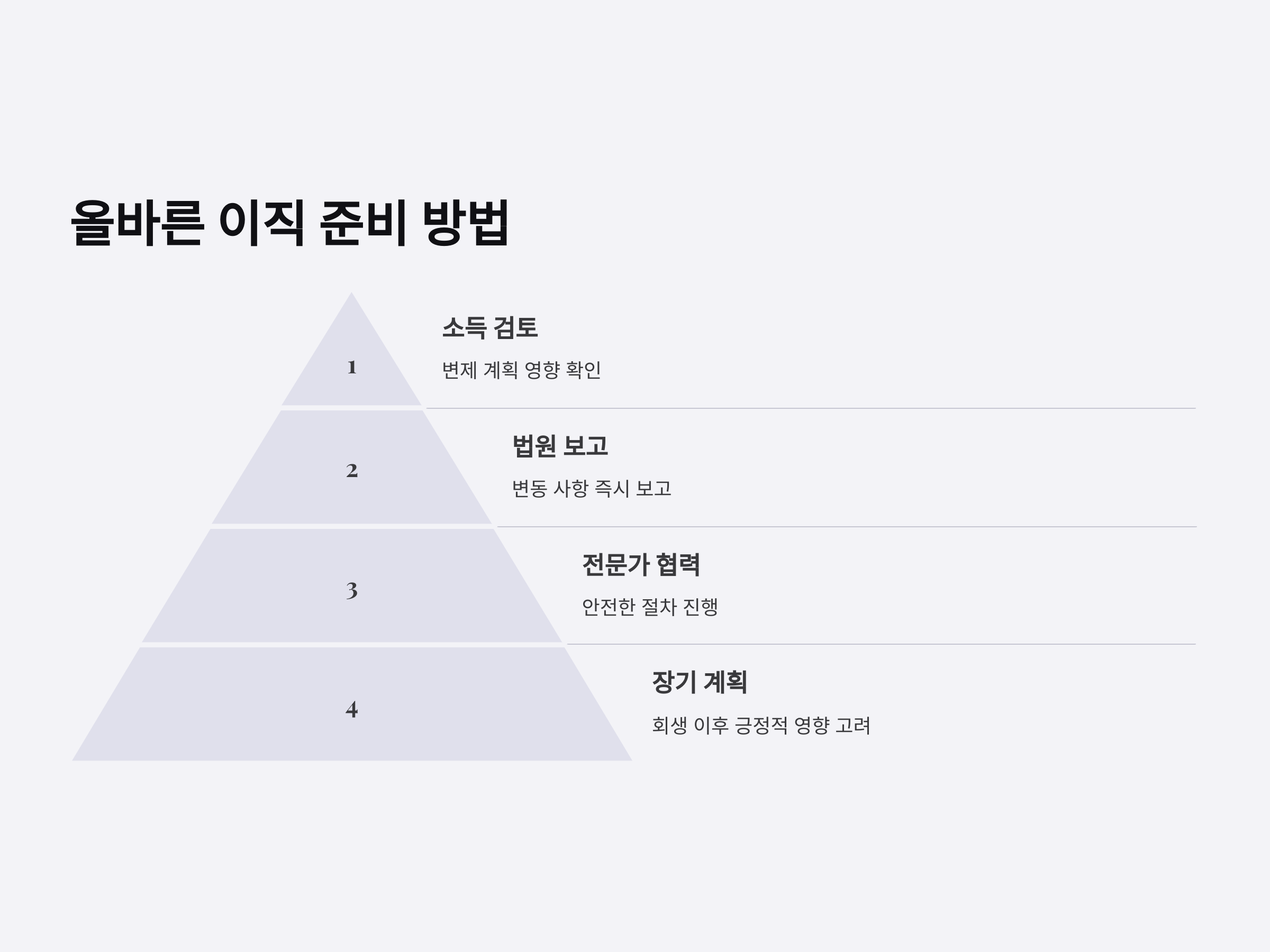 - 법적 신고 요건: 모든 소득 변화는 즉시 신고해야 하며, 이직 사실을 법원에 알리지 않으면 절차가 취소될 수 있습니다.