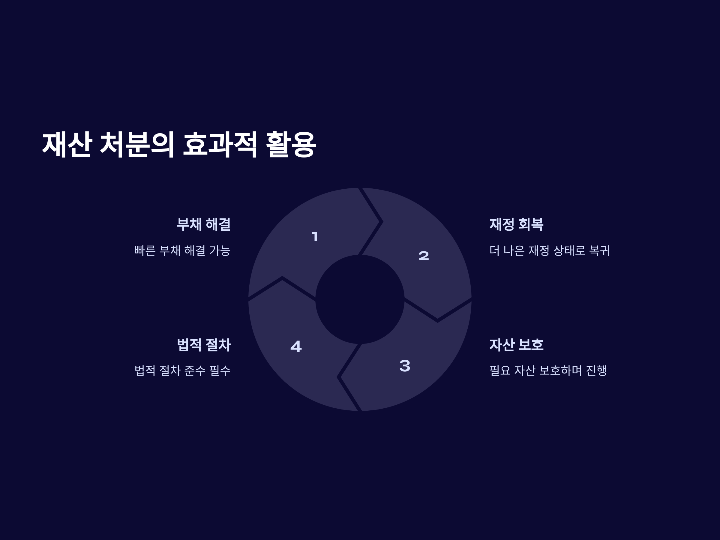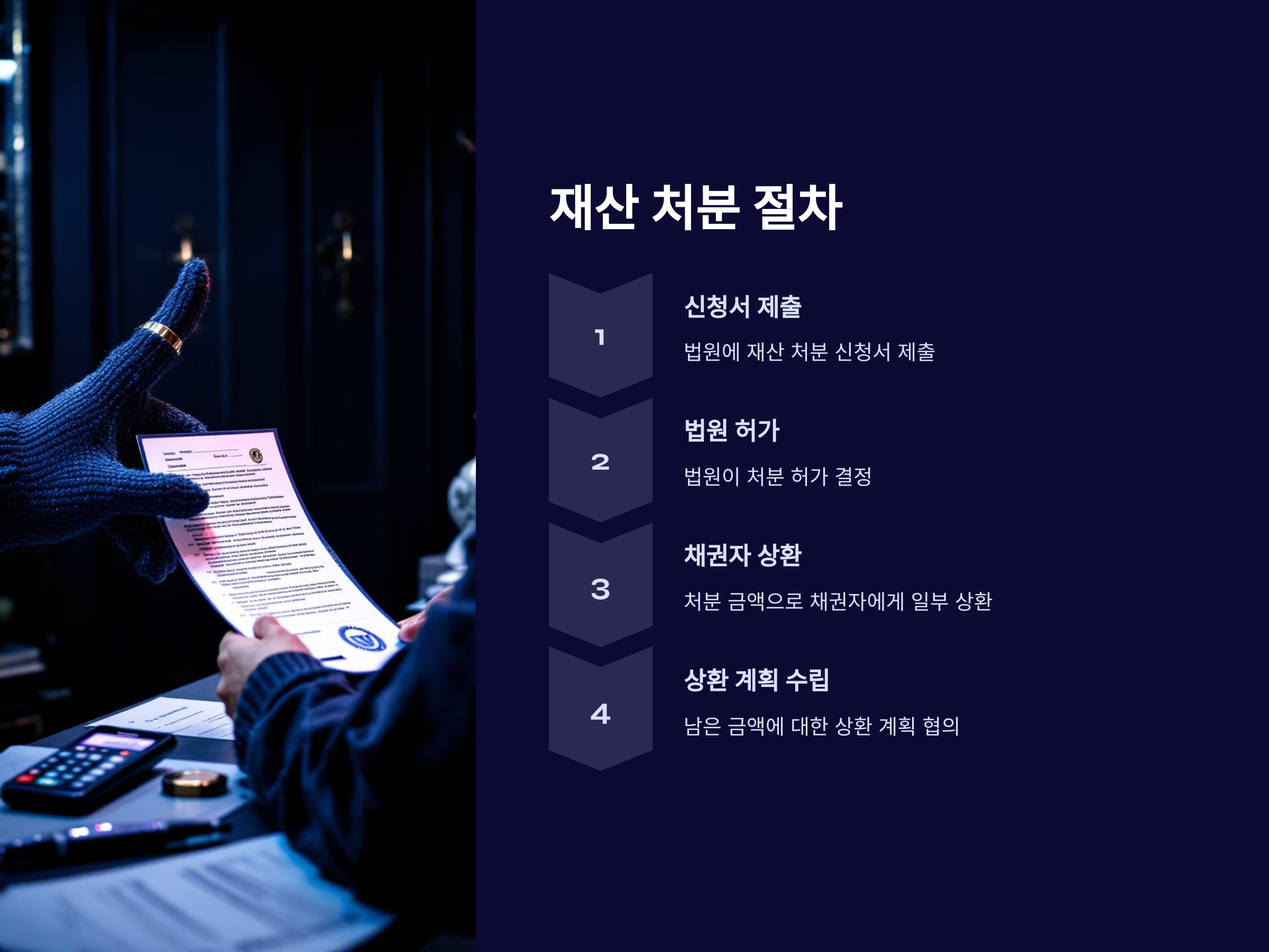재산 처분은 단순히 자산을 팔아서 얻은 금액을 상환하는 것이 아니라, 법적인 절차와 승인을 거쳐야 합니다. 처분을 원할 경우, 채무자는 법원에 재산 처분 신청서를 제출해야 합니다. 이때 법원은 처분된 자산이 채무자에게 꼭 필요한 부분을 제외하고는 채권자들에게 상환될 수 있도록 허가를 내립니다.
