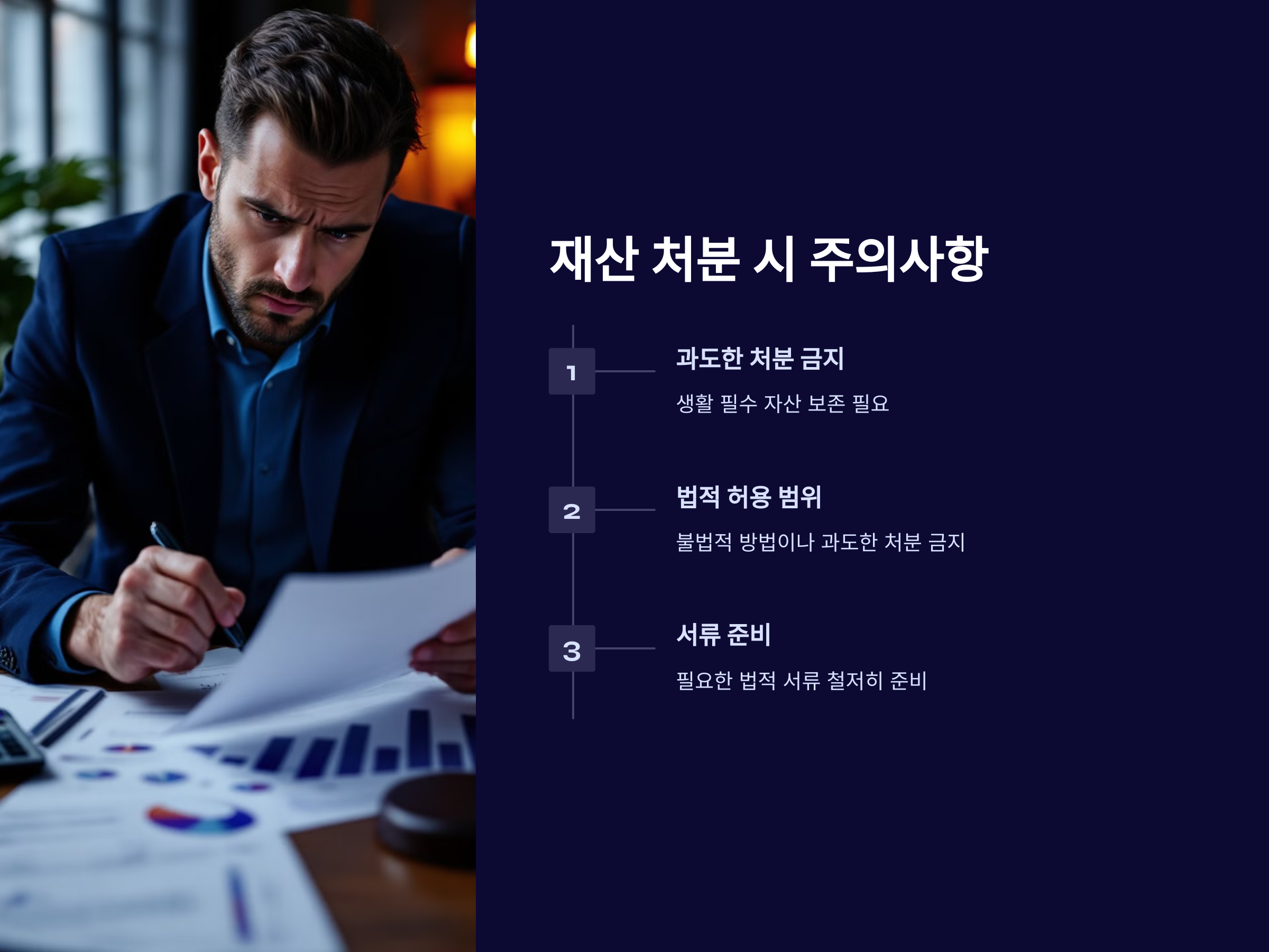 둘째, 처분된 재산이 법적으로 허용된 범위 내에서 이루어져야 합니다. 불법적인 방법이나 과도한 처분이 이루어질 경우, 회생 절차가 불이익을 받을 수 있습니다. 따라서 반드시 법적인 절차를 따르고, 필요한 서류를 준비하는 것이 중요합니다.