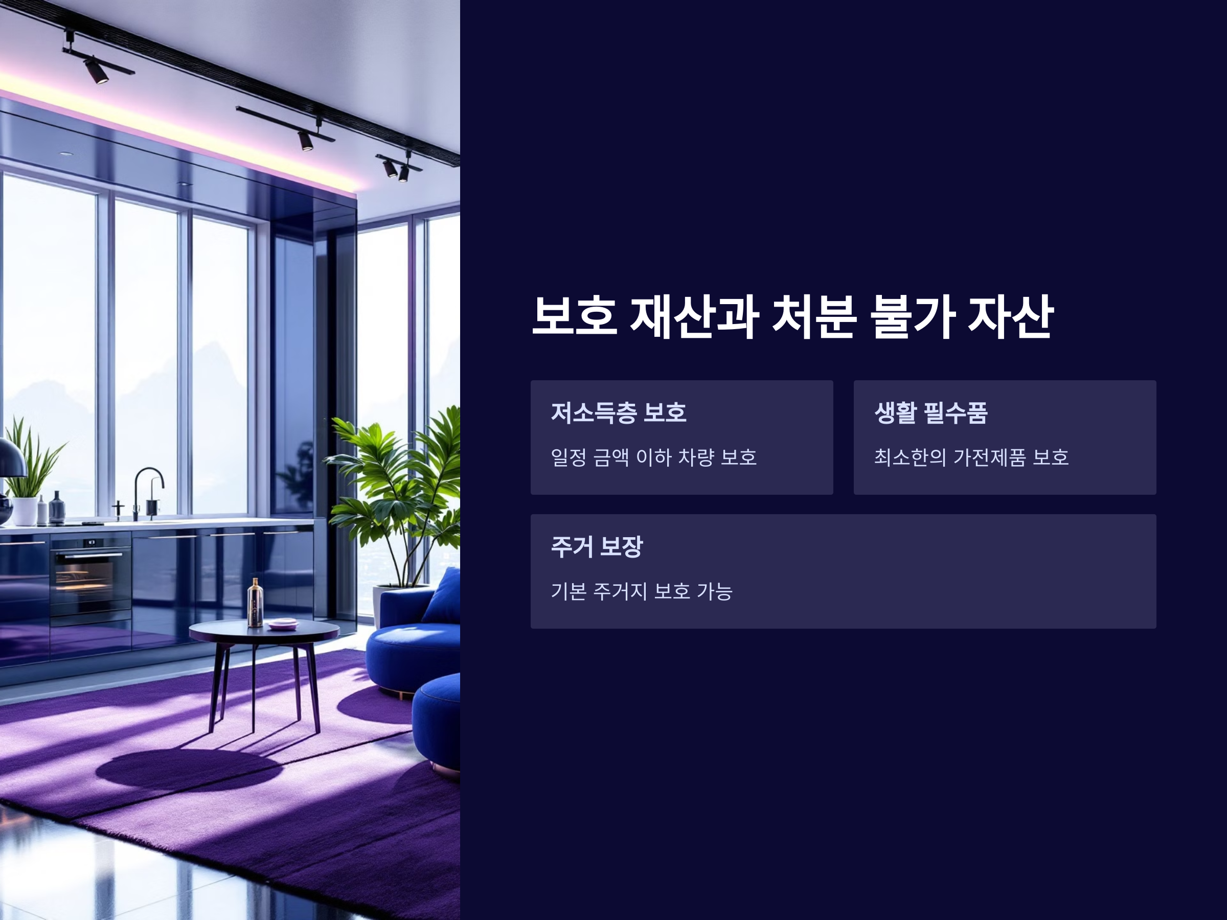 법원은 채무자의 생활 상황을 고려하여 보호 재산 목록을 인정하며, 이에 대한 처분을 요구하지 않습니다. 보호 대상 자산의 범위는 주거지, 기본적인 생필품, 생계 유지에 필요한 소액의 자산 등으로 한정될 수 있습니다.