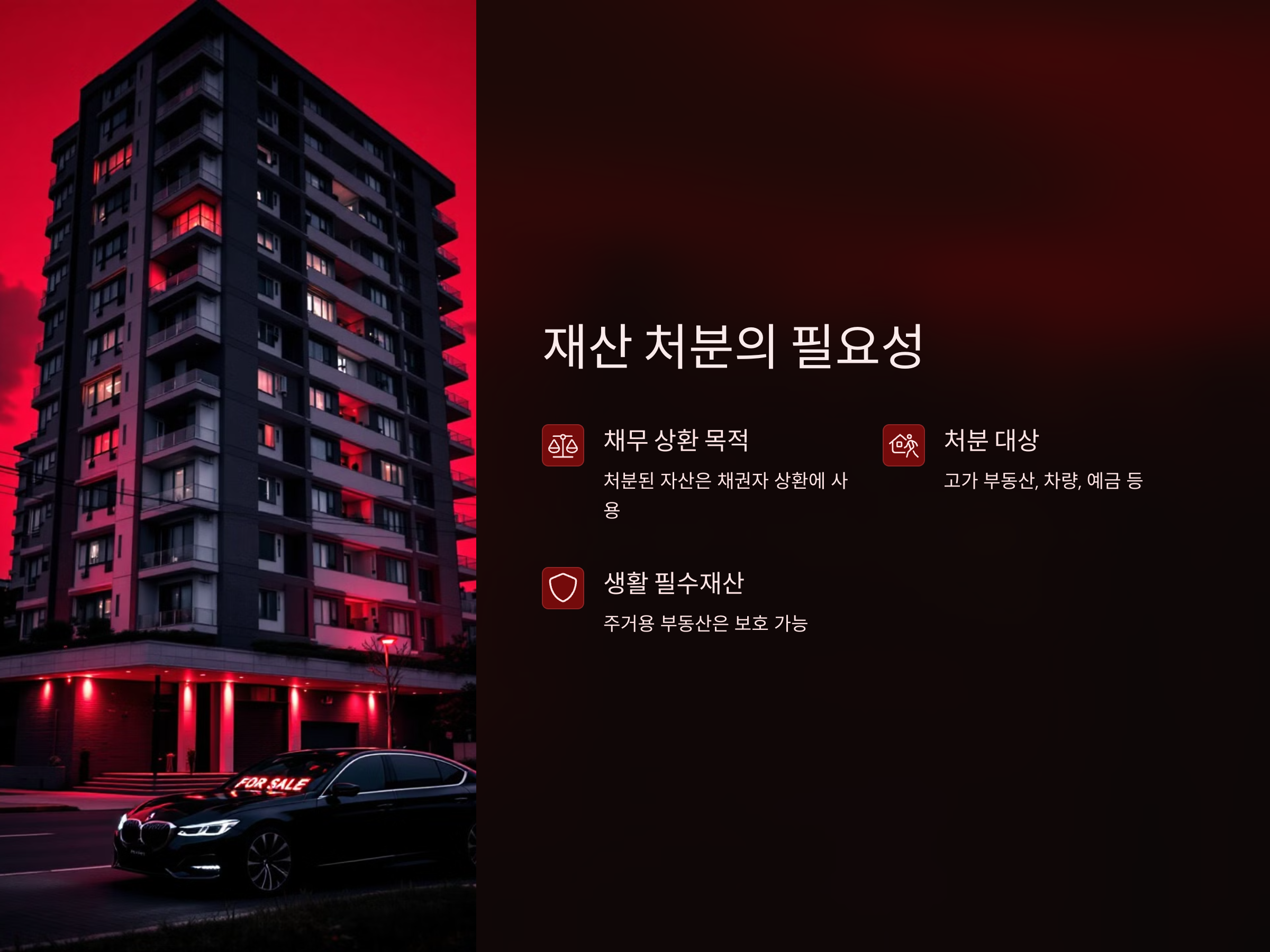 그렇다면 어떤 재산이 처분 대상이 될 수 있을까요? 주로 고가의 부동산이나 차량, 예금과 같은 유동 자산이 처분 대상이 될 수 있습니다. 또한, 일정 조건을 충족한 경우 생활 필수적인 재산은 보호될 수 있는 규정이 마련되어 있습니다. 예를 들어, 주거용 부동산은 주거 안정성이 보장되므로 처분되지 않을 가능성이 큽니다.