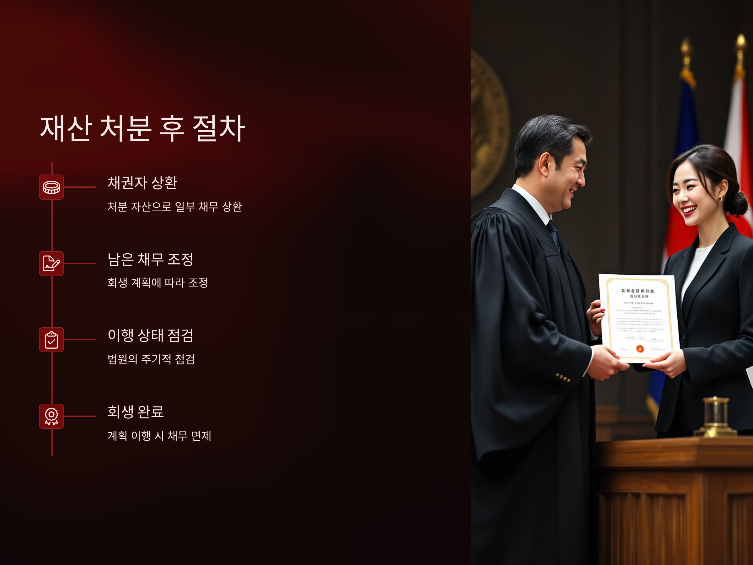 이후에도 법원은 회생 절차의 이행 상태를 체크하며, 채무자가 회생 계획을 제대로 이행하는지 주기적으로 점검합니다. 처분된 자산으로 일부 채권자에게 상환하고 남은 부채는 회생 계획에 맞춰 갚아 나가게 됩니다.