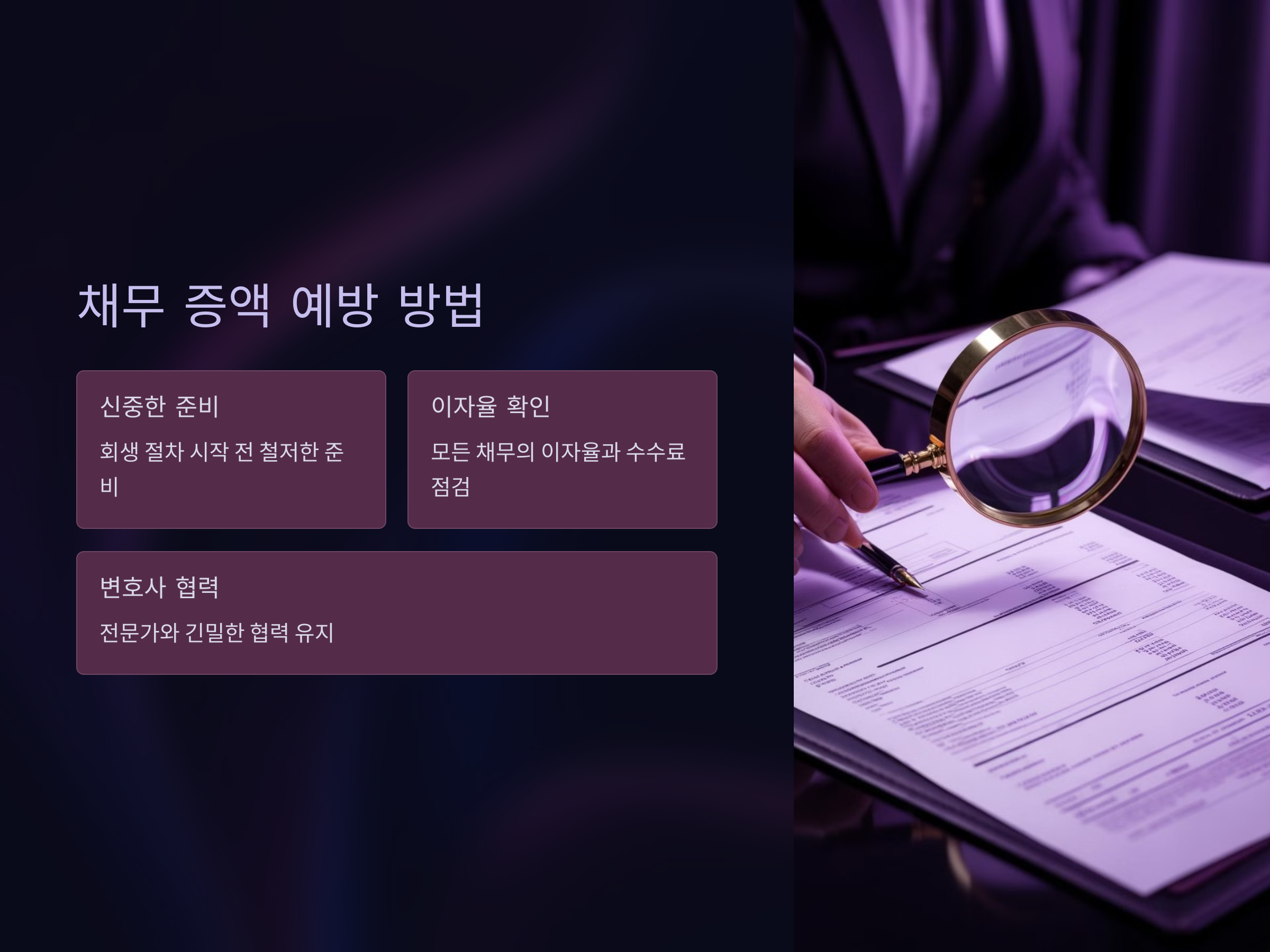 채무 증액을 미리 예방하기 위해서는, 개인회생 절차를 신중하게 준비하는 것이 중요합니다. 회생 절차가 시작되기 전에 채무 금액, 이자율, 기타 수수료 등을 정확히 파악하고, 변호사와 충분한 상담을 하는 것이 필요합니다.