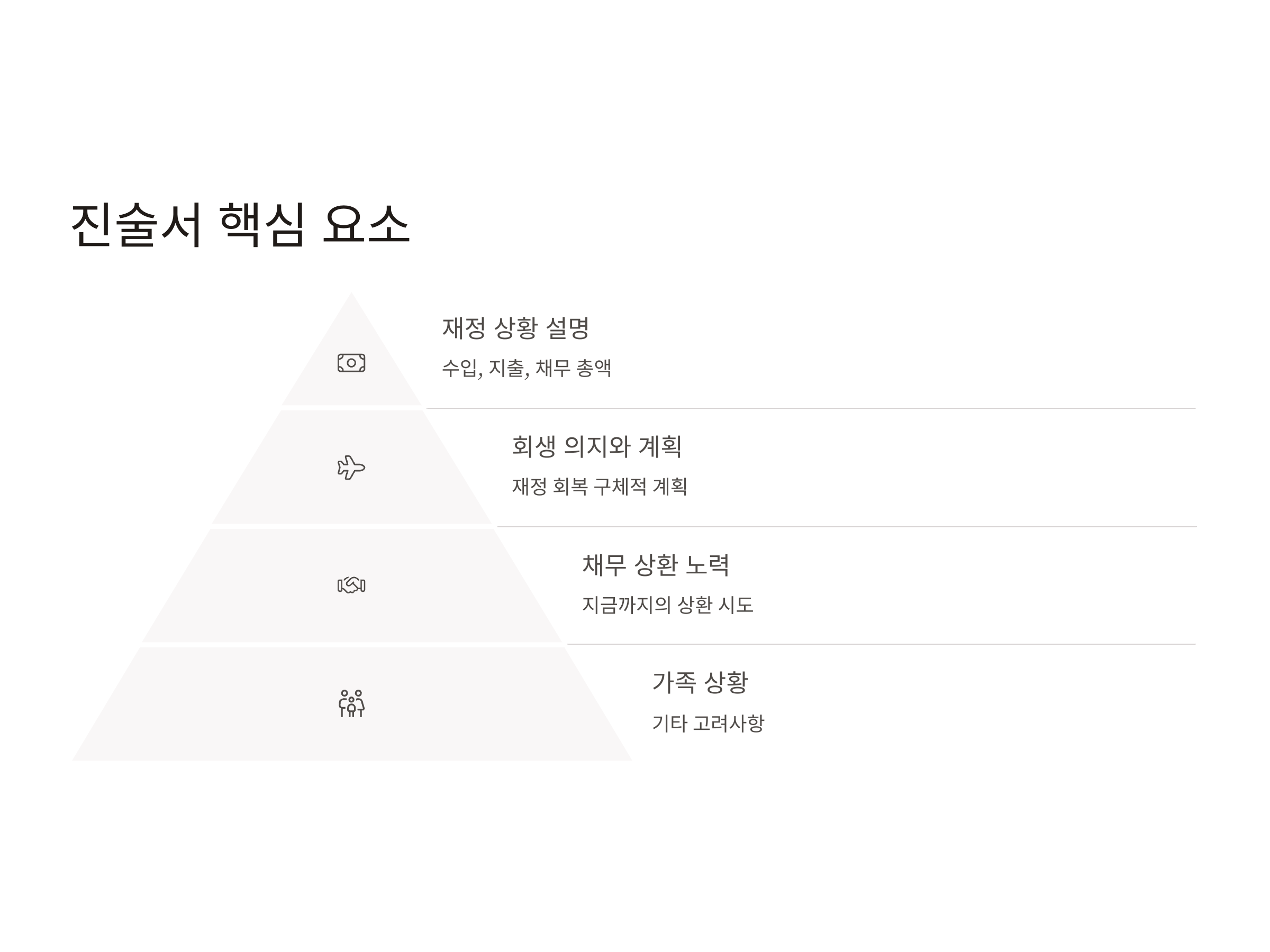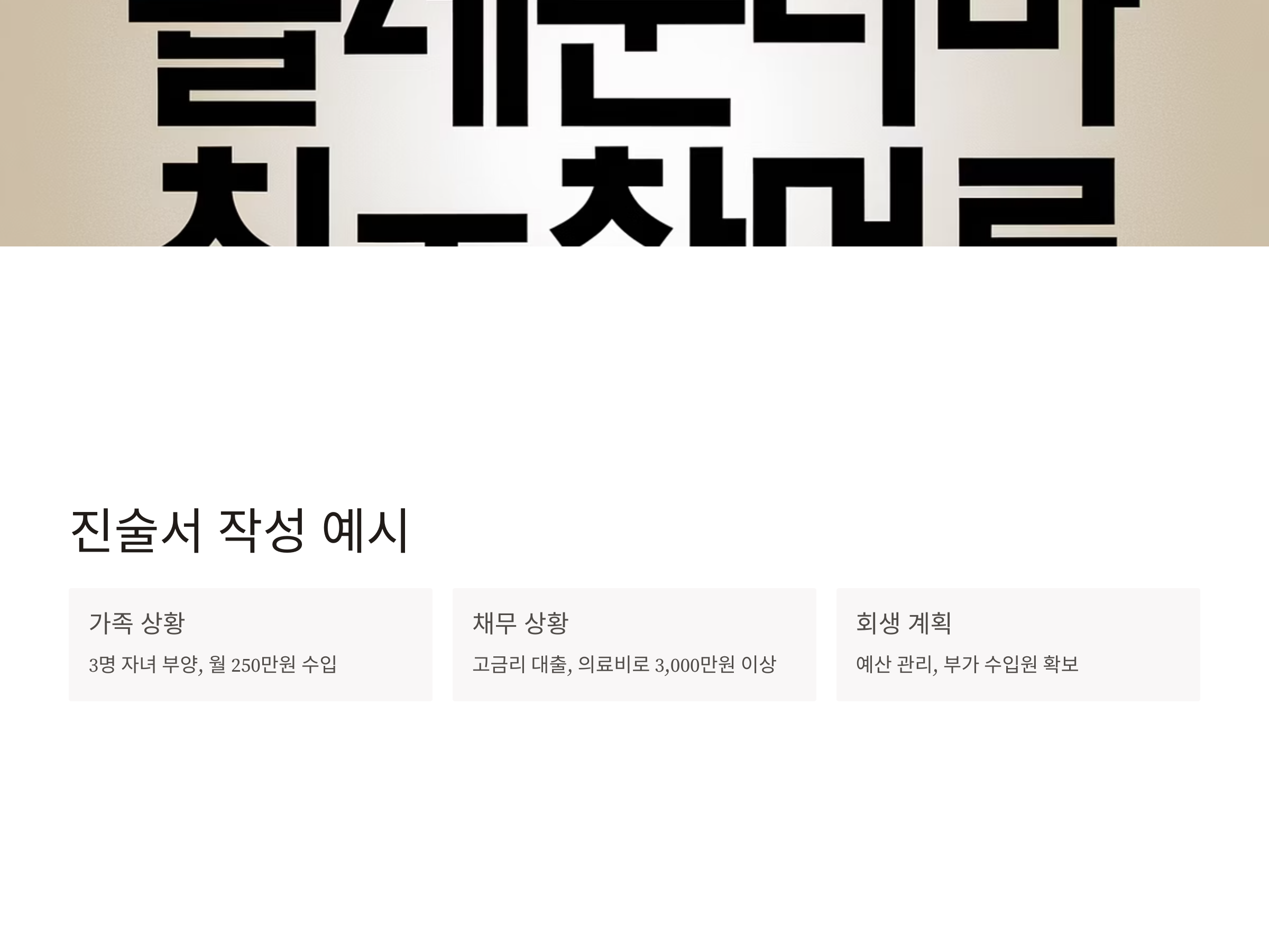 진술서에서는 자신의 회생 의지를 강조하고, 재정적으로 회복하려는 노력과 의지가 충분히 전달되어야 합니다. 단, 이 과정이 지나치게 부정적이거나 절망적인 느낌을 주면 불리할 수 있습니다.