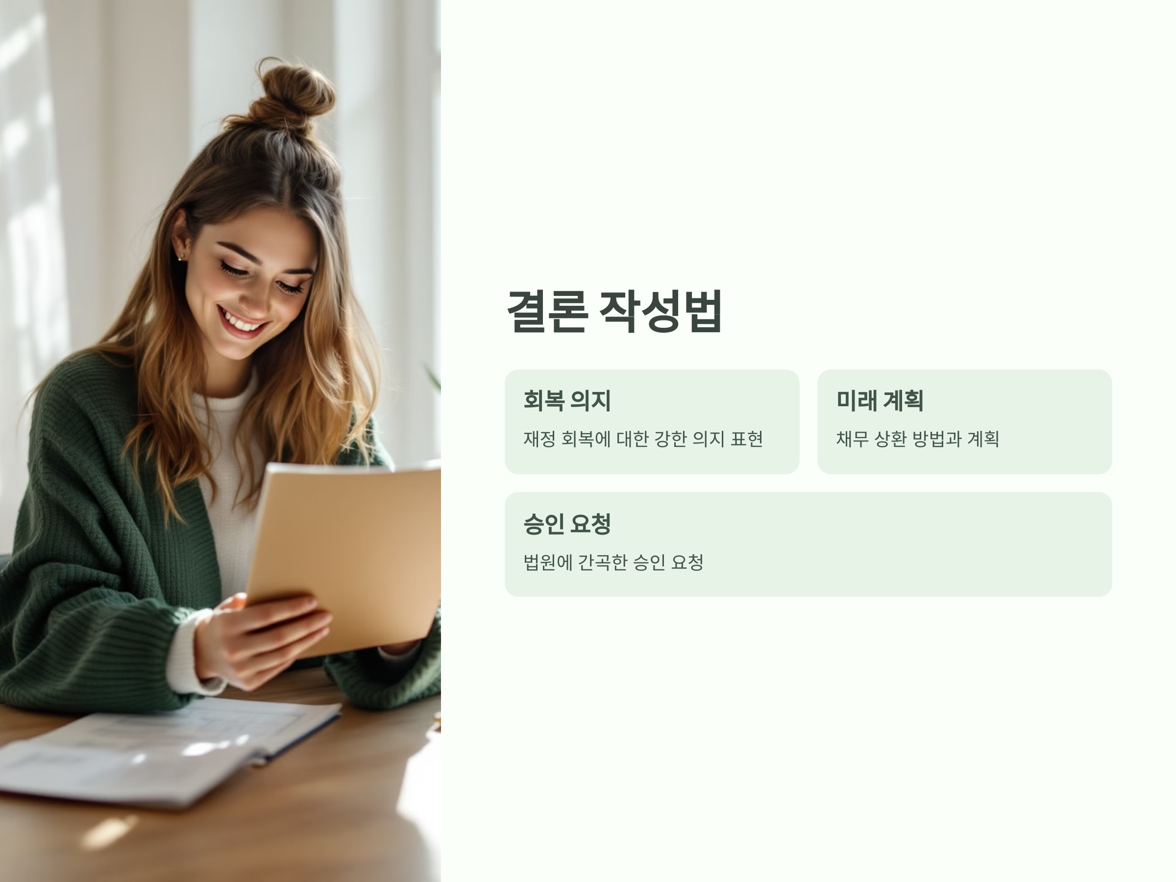 결론에서는 회생 절차를 통해 재정 회복 의지를 밝히고, 법원이 신청을 승인해 주기를 간곡히 요청하는 내용이 담겨야 합니다. 또한 회생 절차가 마무리되면 어떻게 채무를 갚아 나갈 수 있을 것인지에 대한 회복 가능성을 설명합니다.