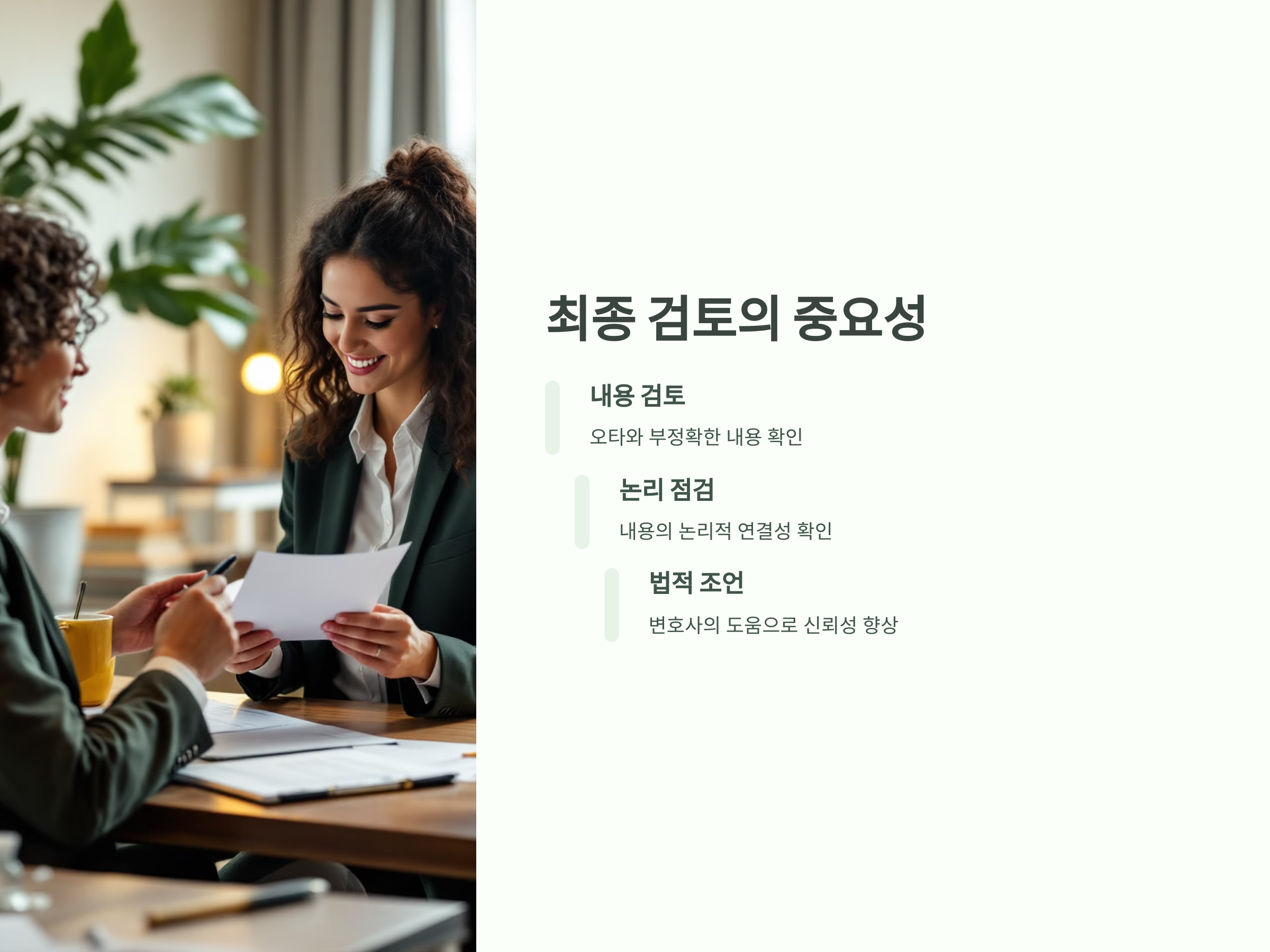진술서를 작성한 후에는 반드시 검토 과정을 거쳐야 합니다. 다른 사람에게도 읽어 보도록 하고, 문법이나 표현의 오류가 없는지 확인하세요. 진술서에 오타나 부정확한 내용이 있으면 법원에서 불신을 일으킬 수 있습니다. 또한, 진술서의 내용이 명확하고 논리적으로 연결되는지 점검하는 것도 중요합니다.