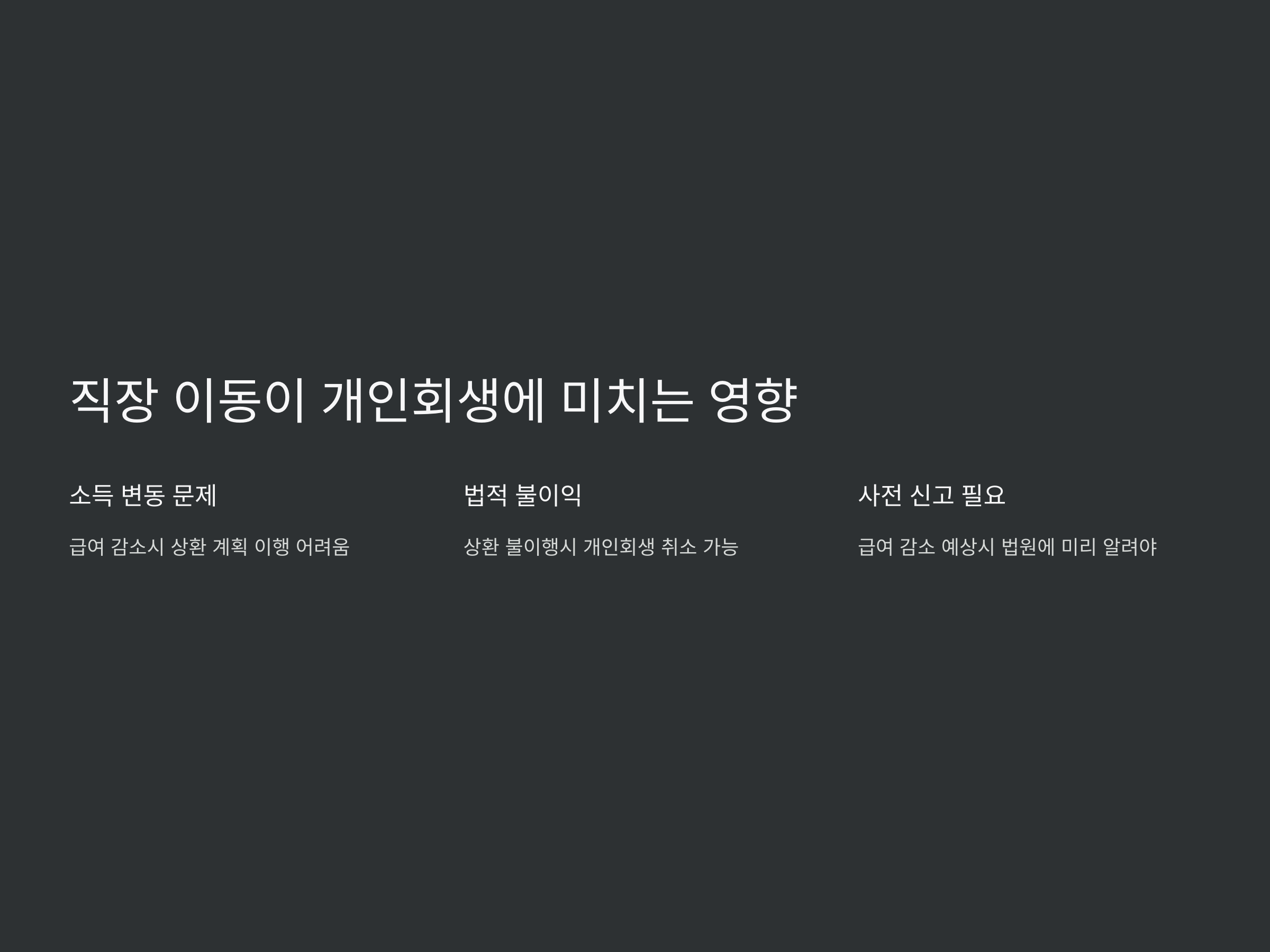 따라서 개인회생 중 직장 이동을 고려할 때는 급여 수준이나 직장의 안정성 등을 면밀히 검토하고, 만약 급여가 감소할 가능성이 있다면 이를 사전에 법원에 알리고 상환 계획을 수정하는 절차를 거쳐야 합니다.