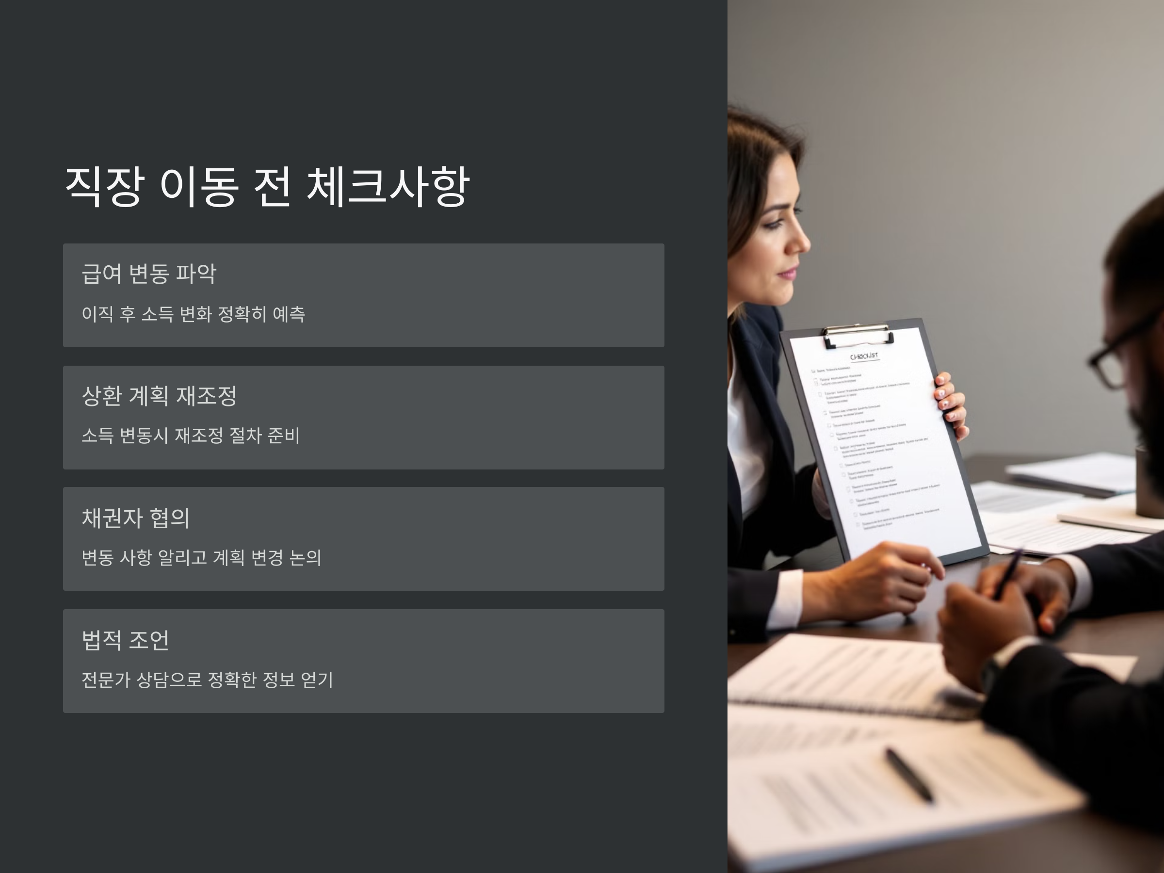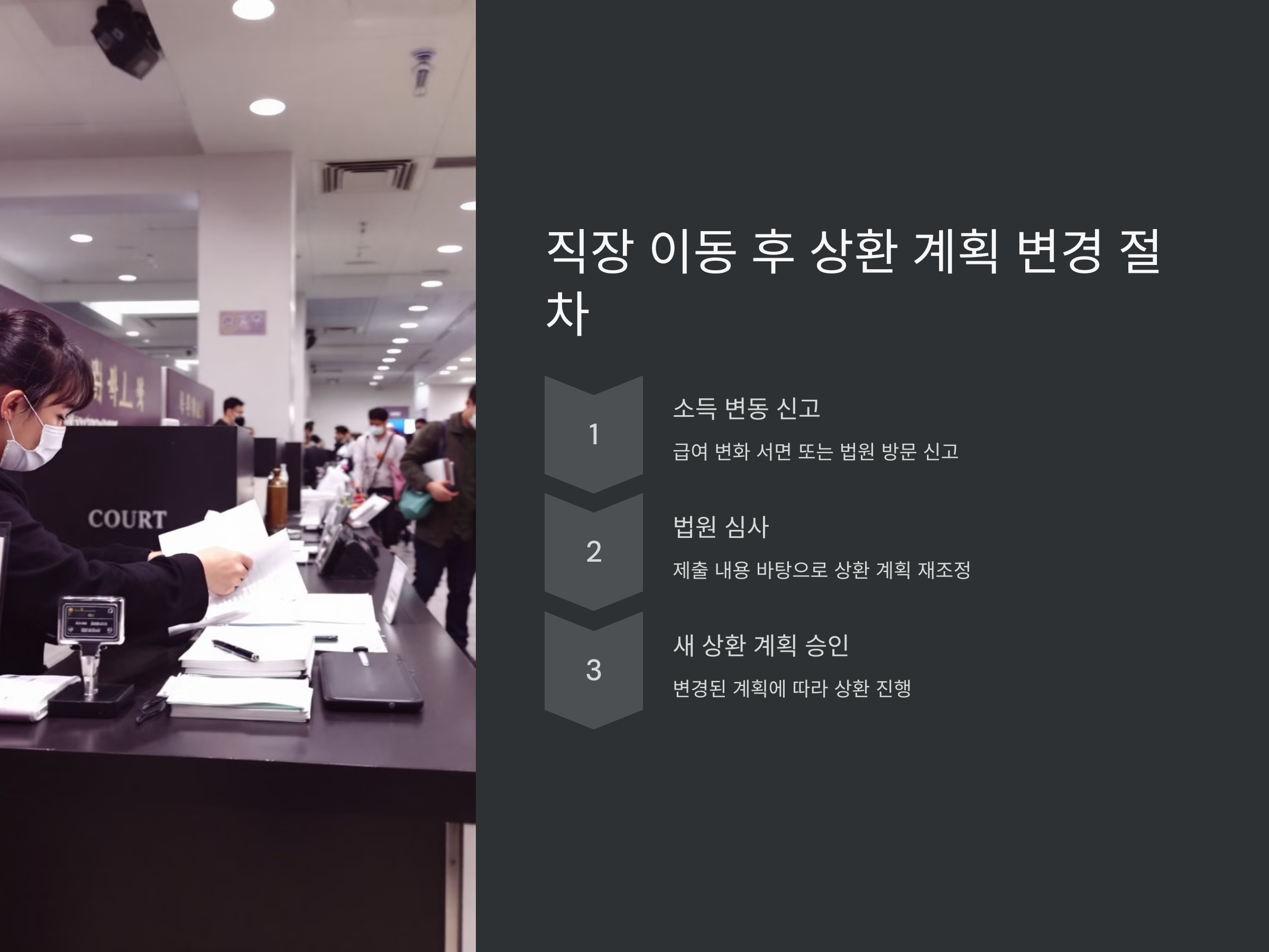 만약 직장 이동 후 급여가 감소하거나 소득에 변동이 생기면, 상환 계획을 변경하는 절차를 밟아야 합니다. 상환 계획을 변경하려면, 법원에 변동 사항을 신고하고 재조정 신청을 해야 합니다. 이때 법원은 소득 변동 사항을 토대로 새로운 상환 계획을 설정할 수 있습니다.