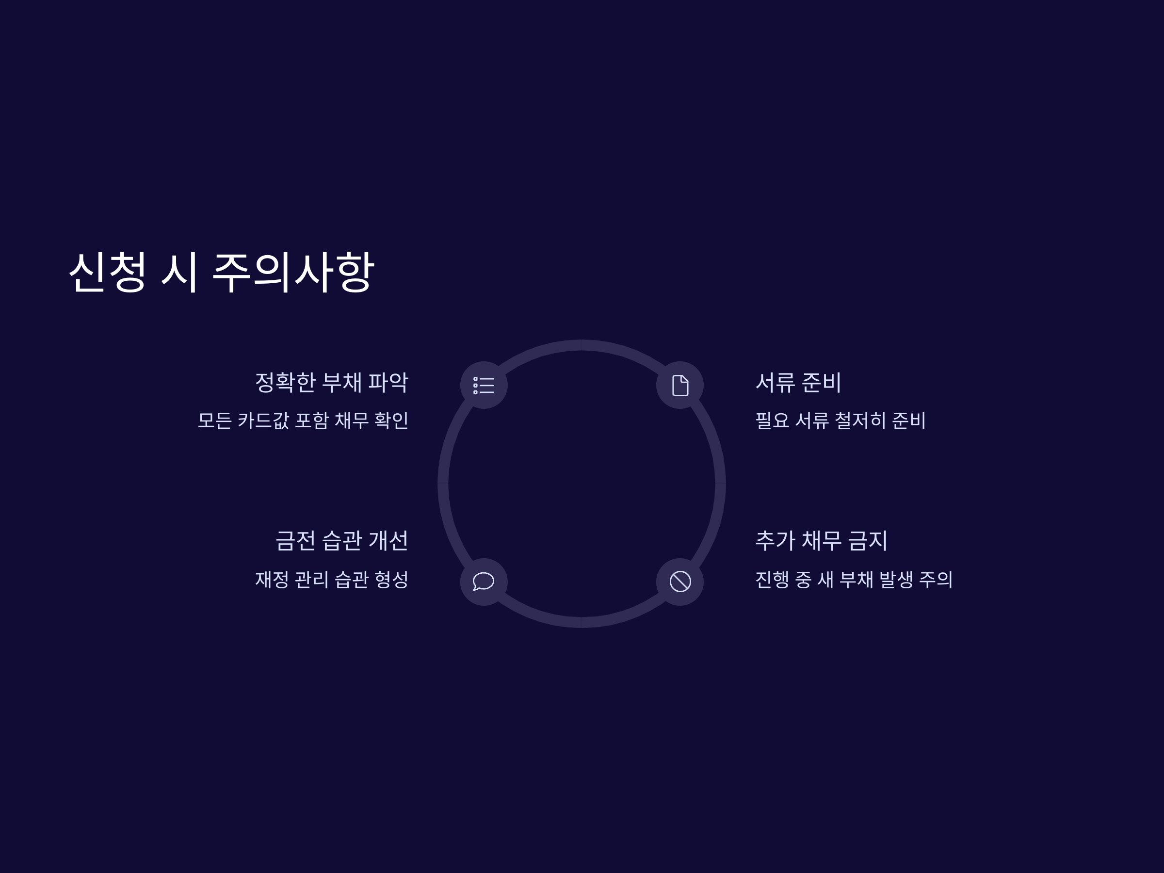 개인회생 신청 시에는 몇 가지 주의해야 할 점이 있습니다. 첫째, 카드값을 포함한 모든 부채를 정확히 파악하고, 그에 맞는 상환 계획을 세워야 합니다. 둘째, 개인회생 신청은 법원에서 결정되는 절차이므로, 신청 시 필요한 서류나 절차를 제대로 준비해야 합니다. 법원의 승인을 받지 못할 경우, 개인회생이 불가능할 수 있으므로 철저한 준비가 필요합니다.