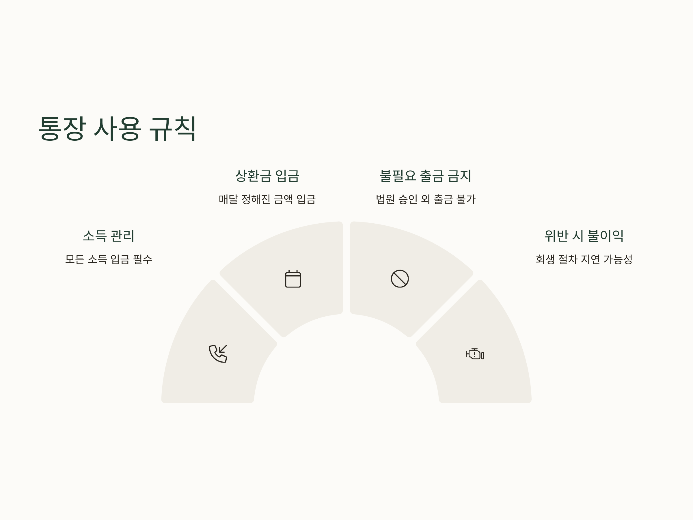 또한, 이 통장에는 상환금액을 매달 입금해야 하며, 상환 계획에 따라 정해진 일정에 맞춰 금액이 출금됩니다. 통장 내에서 불필요한 출금이나 소비가 이루어지지 않도록 관리해야 하며, 이를 위반할 경우 회생 절차에 불이익이 생길 수 있습니다. 법원은 이 통장의 입출금 내역을 철저히 관리하고 있기 때문에, 신청자는 반드시 법원의 규정을 준수해야 합니다.