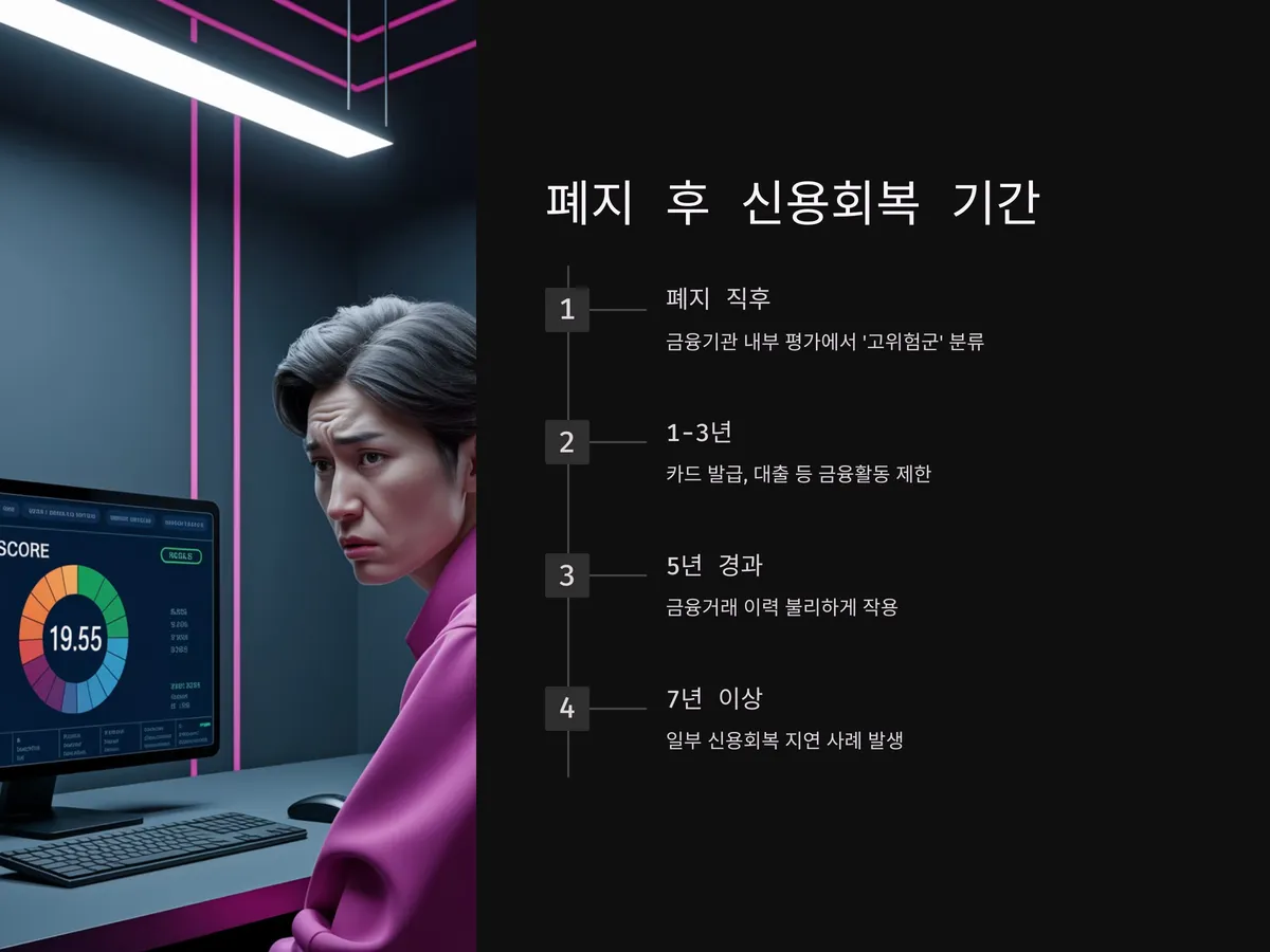 폐지 후 신용회복은 생각보다 오랜 시간이 걸릴 수 있습니다. 폐지 자체가 신용정보에 부정적으로 기록되기 때문에, 회생 종료보다 더 큰 타격이 발생할 수 있습니다. 특히 변제 불이행에 따른 폐지는 금융기관 내부 평가에서 '고위험군'으로 분류되며, 카드 발급, 대출 등 실질적인 금융활동이 제한됩니다.