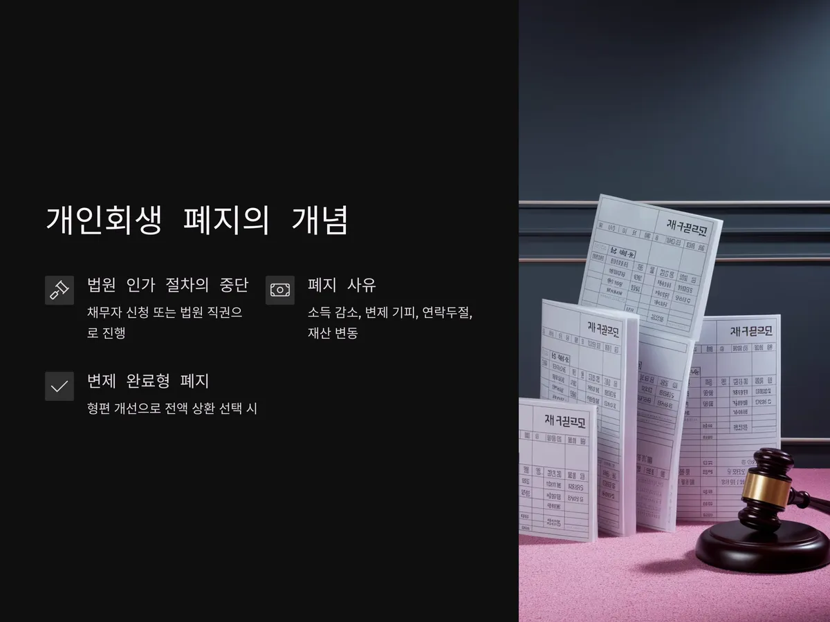 개인회생 폐지란 법원이 인가한 개인회생 절차가 중간에 종료되는 것을 의미합니다. 이는 채무자의 자발적 신청 또는 법원의 직권에 의해 이루어질 수 있으며, 폐지 사유는 다양합니다. 대표적으로는 소득 감소로 인한 변제 불능, 채무자의 고의적인 변제 기피, 주소 불명으로 인한 연락두절, 재산 변동 등의 이유가 있습니다.