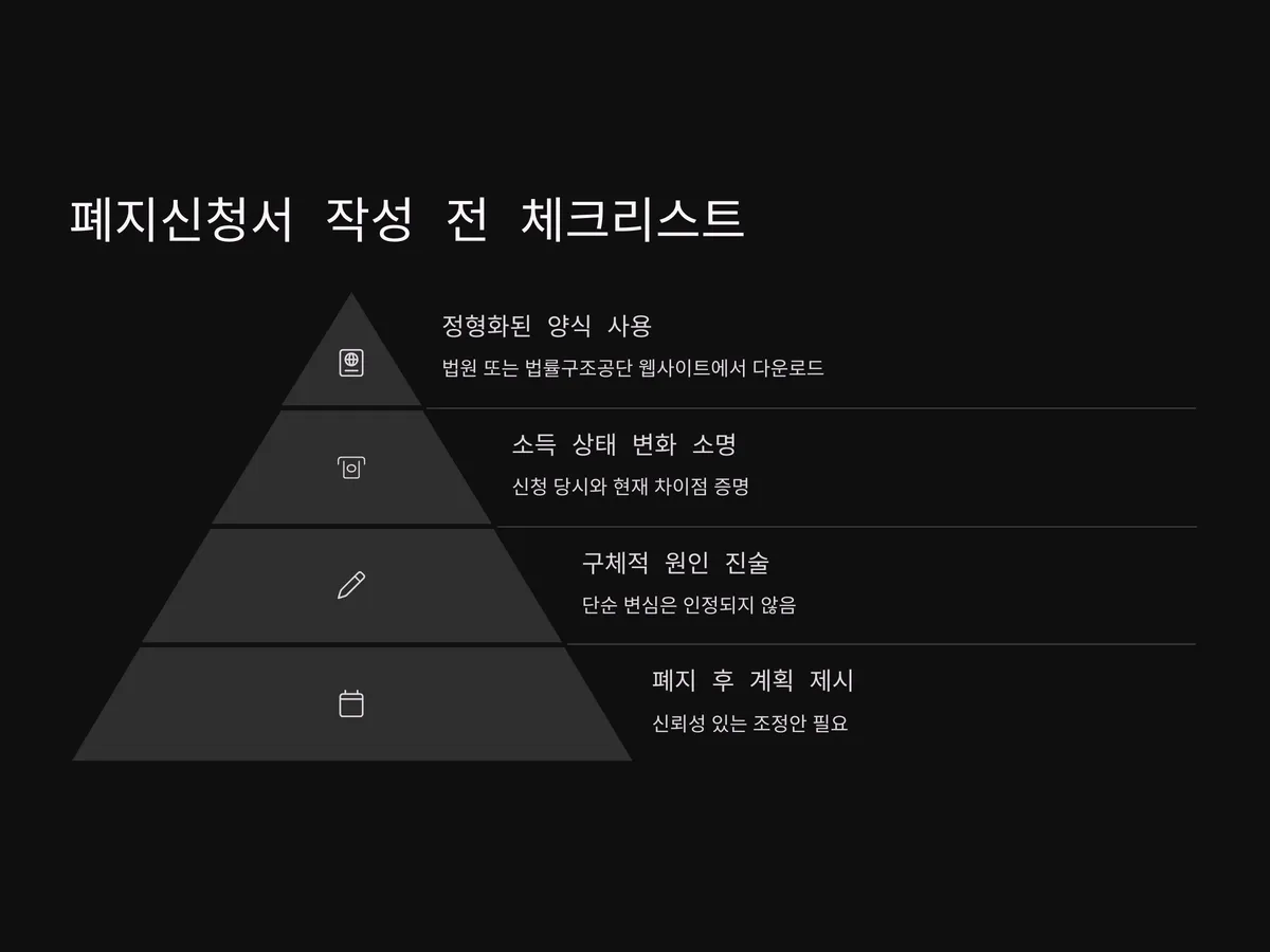 폐지신청서는 단순히 “그만하겠습니다”라고 쓸 수 있는 문서가 아닙니다. 법원은 채무자의 의도, 사유의 타당성, 향후 변제 가능성 등을 종합적으로 고려하여 폐지 여부를 결정합니다. 따라서 폐지신청서를 제출하기 전 아래 사항을 점검해야 합니다.
