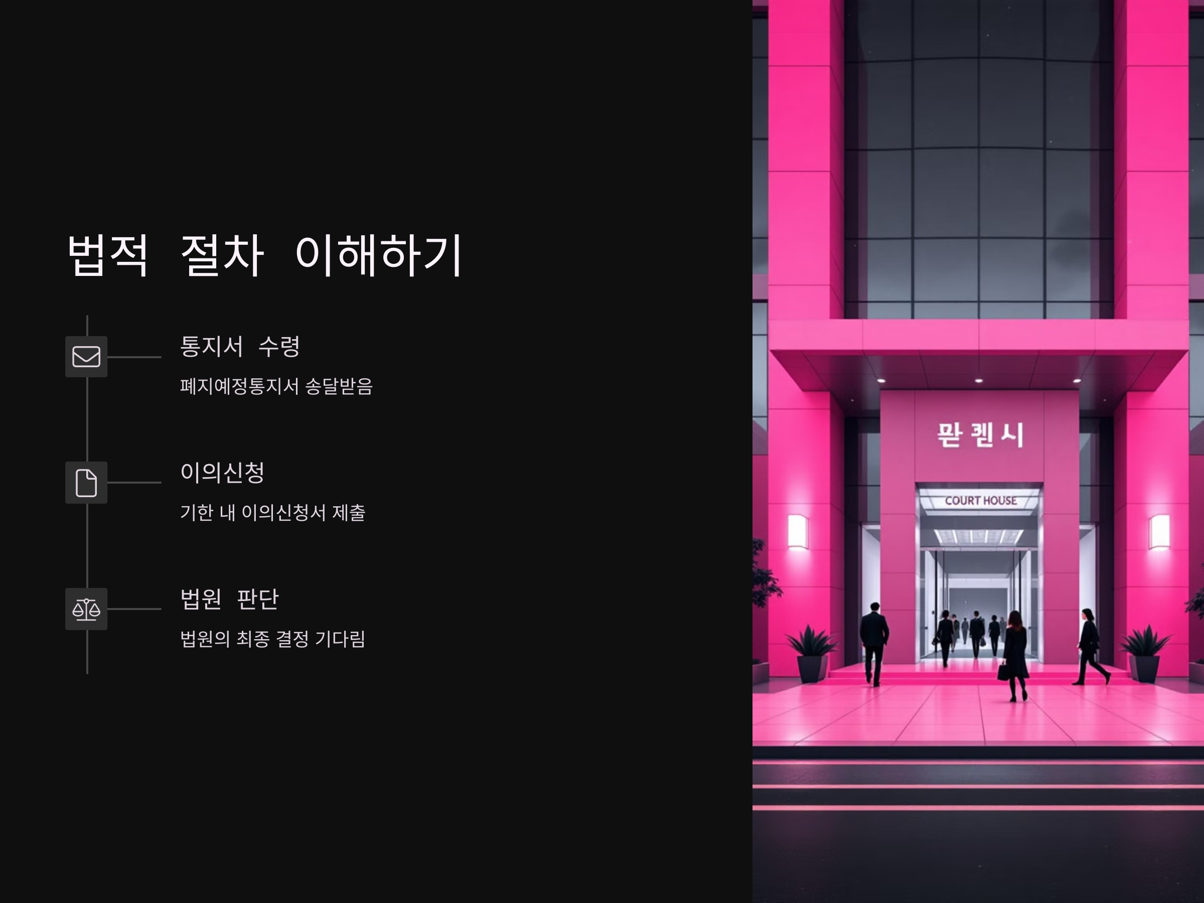 따라서, 폐지예정통지서를 받은 경우, 즉시 전문가의 조언을 받고 대응책을 세우는 것이 중요합니다. 시간은 곧 기회이기 때문에, 문제를 미루지 말고 빠르게 해결책을 모색하는 것이 최선의 방법입니다.