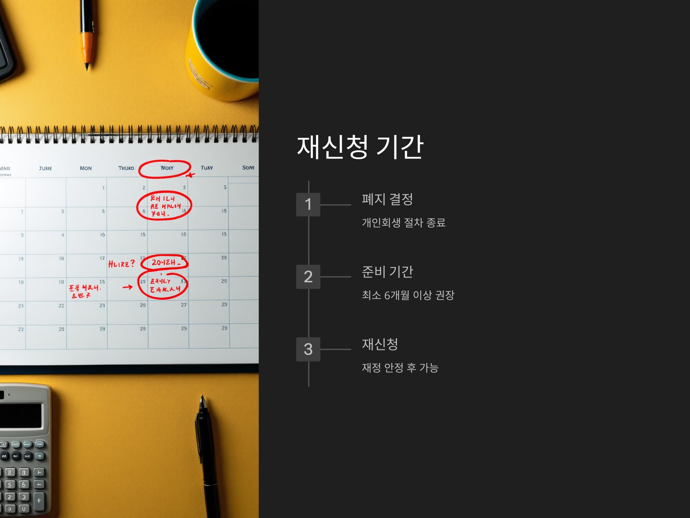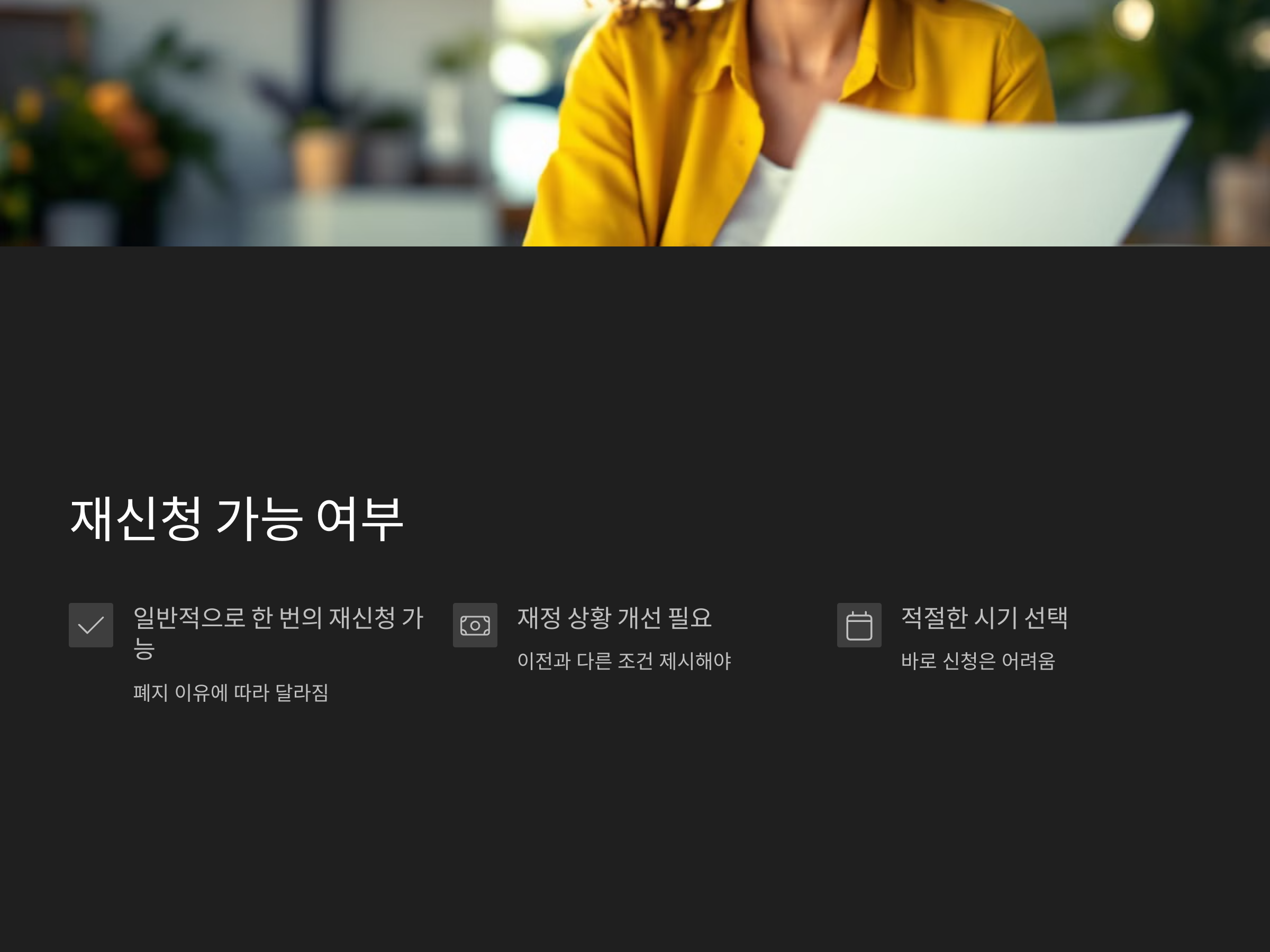 - 재신청 준비 기간: 재신청을 고려하는 경우, 일정 기간 동안 재정적 안정을 위해 노력해야 합니다. 예를 들어, 수입이 안정적으로 확보되고, 기존 부채의 일부를 상환하는 등 준비가 필요합니다.