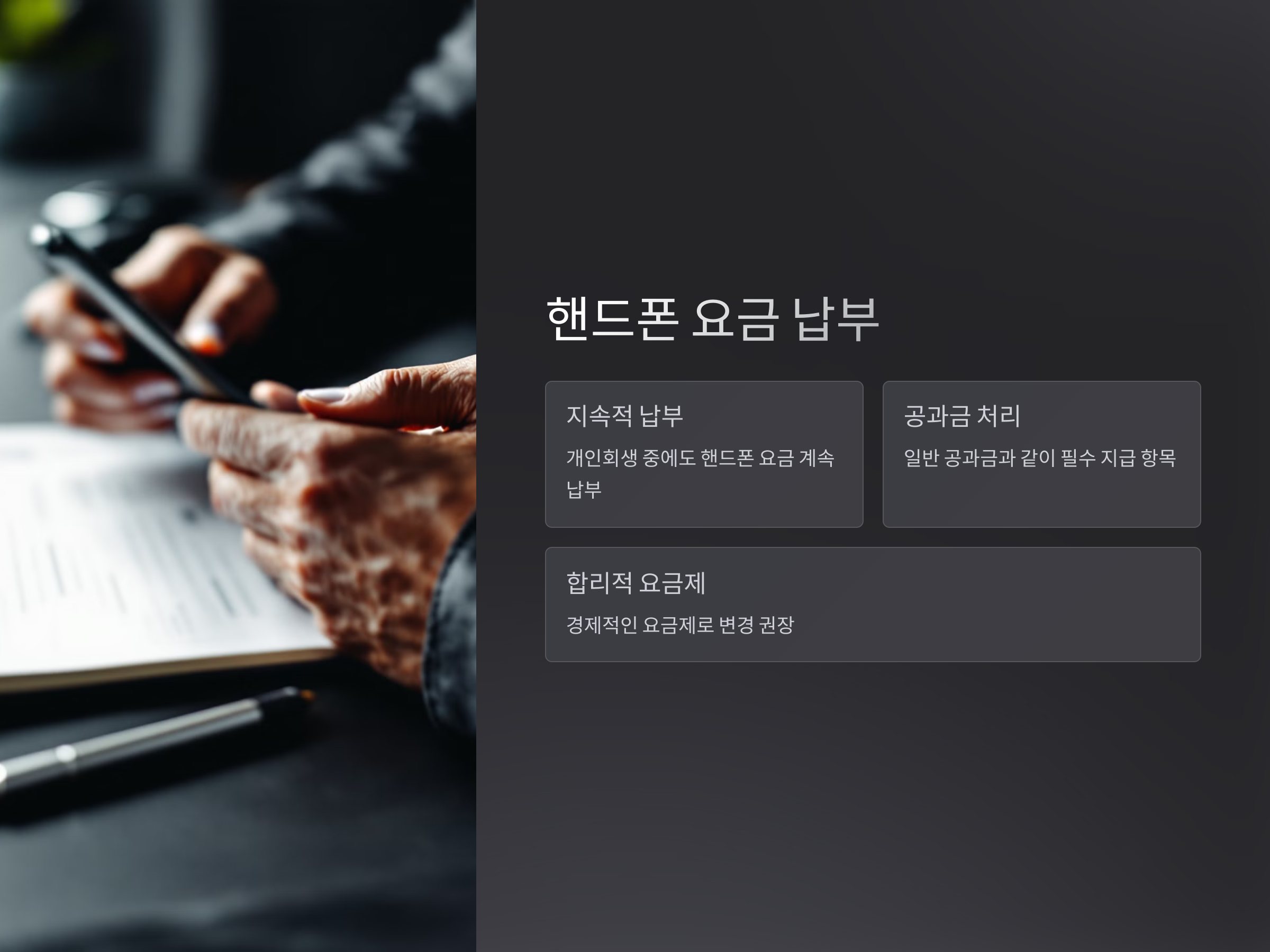 개인회생 신청 중에도 핸드폰 요금 납부는 계속해야 합니다. 이는 일반적인 공과금 납부와 비슷하게 처리되며, 개인회생 계획에 따라 핸드폰 요금도 필수적으로 지급해야 하는 항목으로 간주됩니다. 다만, 요금제에 대한 선택은 신중하게 해야 합니다. 너무 비싼 요금제를 유지하는 것보다는 합리적인 요금제를 선택하는 것이 좋습니다.