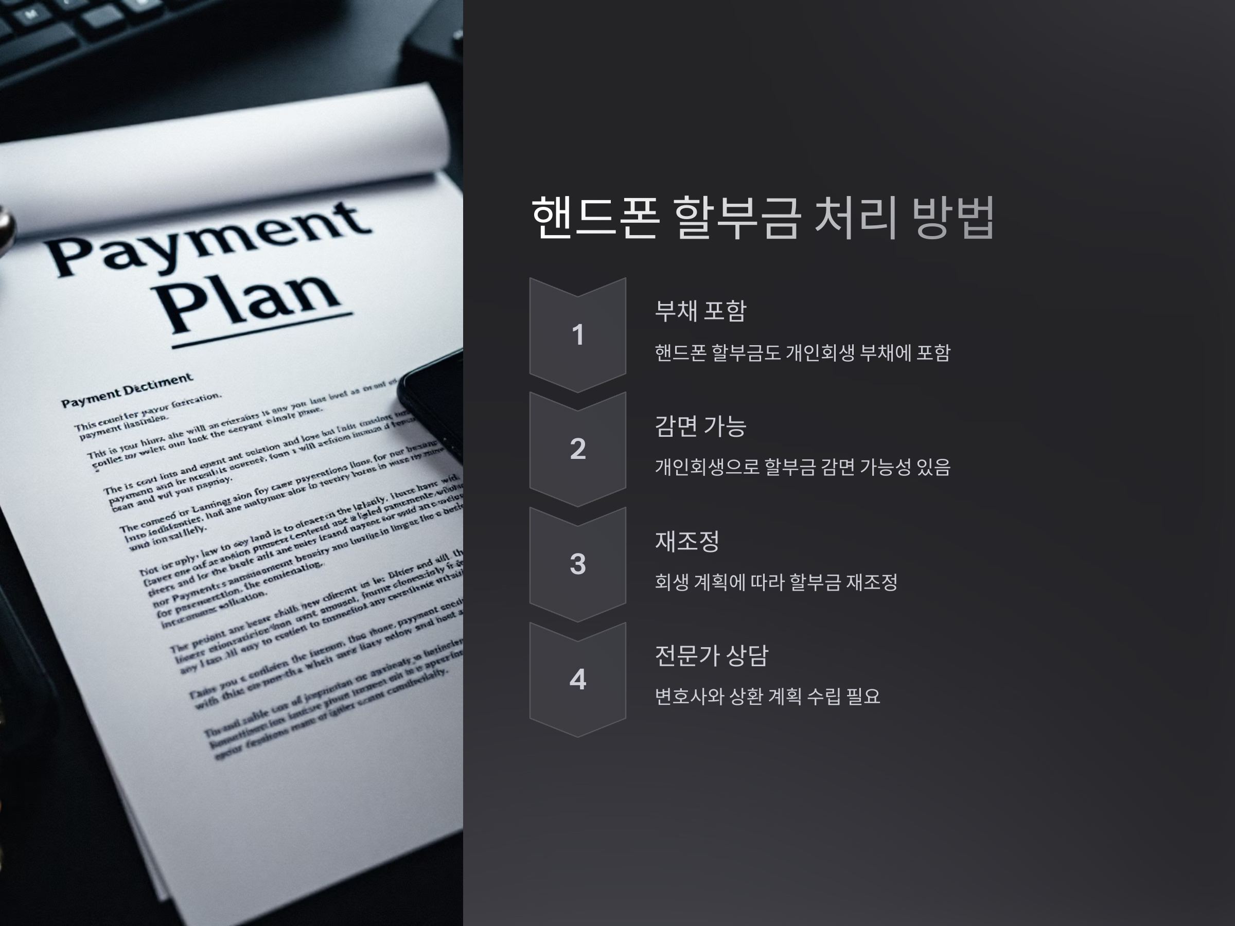 개인회생을 신청한 상태에서 핸드폰 할부금이 남아 있다면, 그 할부금도 포함되어 부채로 처리됩니다. 이때 중요한 점은 핸드폰 할부가 포함된 부채가 개인회생에 의해 감면될 수 있다는 것입니다. 물론, 할부금의 미납액이 그대로 남아있을 수 있기 때문에, 회생 계획에 따라 재조정될 수 있습니다. 즉, 할부금도 변동 가능성이 있기 때문에, 이에 대한 구체적인 상담을 받는 것이 중요합니다.