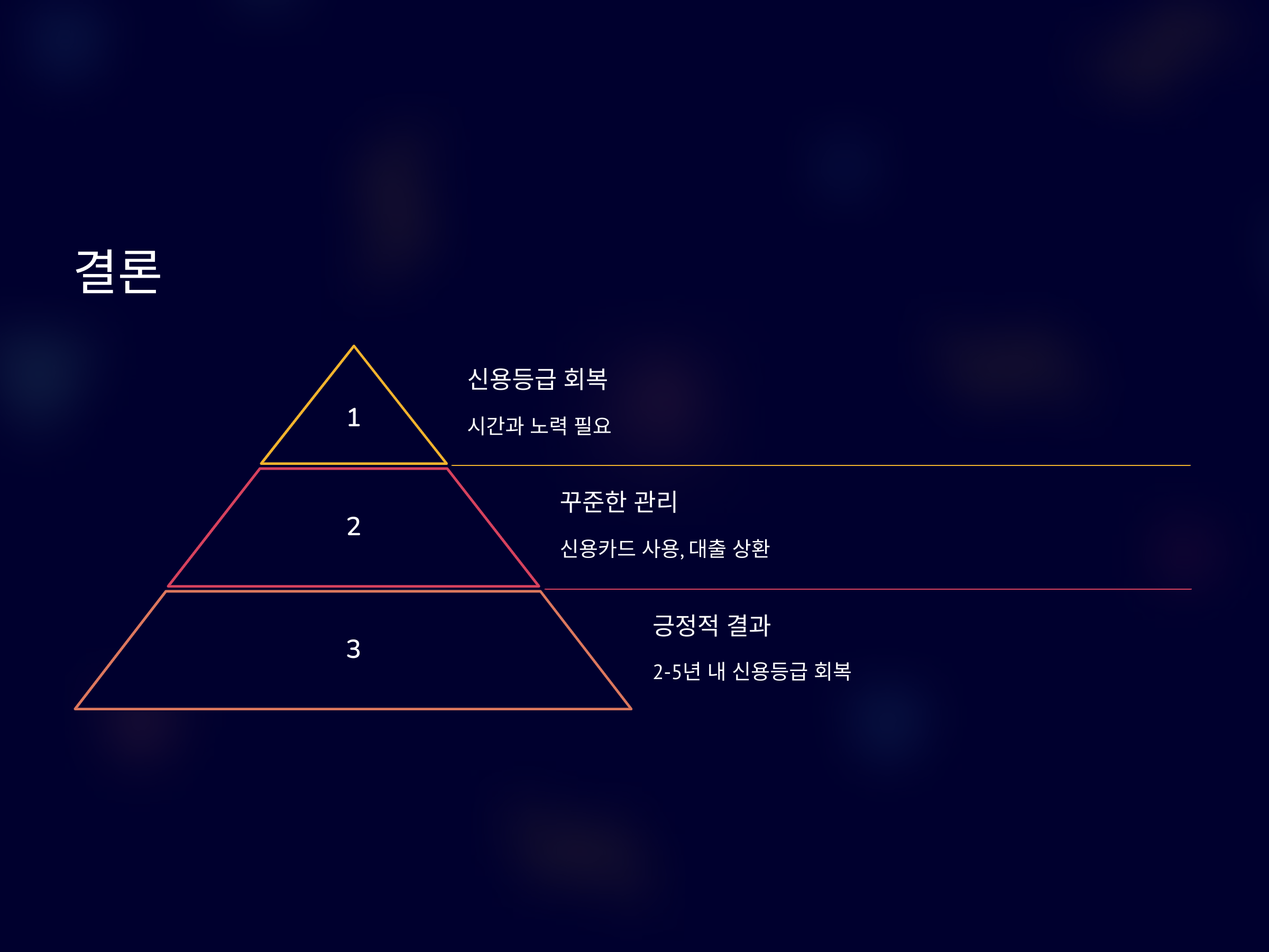 - 1년~2년 후: 개인회생 기록이 신용정보에서 점차 사라지고, 새로운 신용 거래 이력이 쌓이기 시작합니다. 이때부터 신용등급의 상승이 눈에 띄게 나타날 수 있습니다. 특히, 연체 없이 안정적인 신용 거래를 유지하면 신용등급의 회복이 빨라집니다.