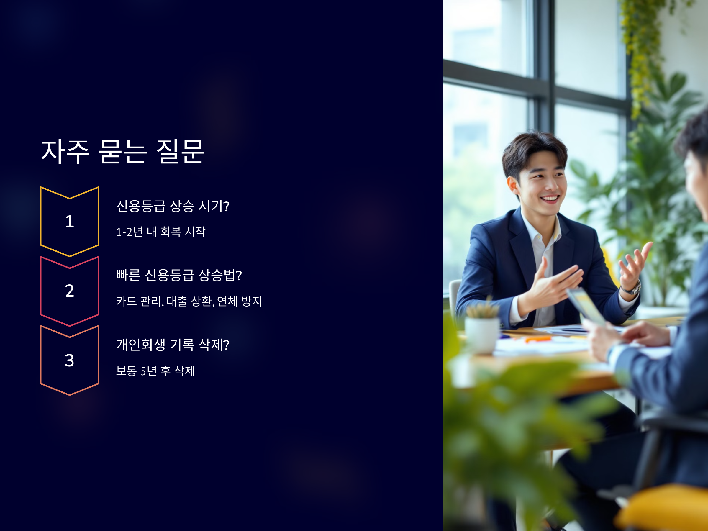 - 2년 이후: 대부분의 경우, 개인회생 종료 후 2년이 지나면 신용등급이 꽤 많이 회복됩니다. 이 시기에는 신용카드 사용 및 대출 상환 이력이 쌓여 신용정보가 긍정적인 영향을 미치기 시작합니다. 다만, 개인회생 기록이 완전히 제거되는 데는 최대 5년이 걸릴 수 있으므로, 완전한 신용등급 회복을 위해서는 일정 기간 동안 꾸준한 신용 관리가 필요합니다.