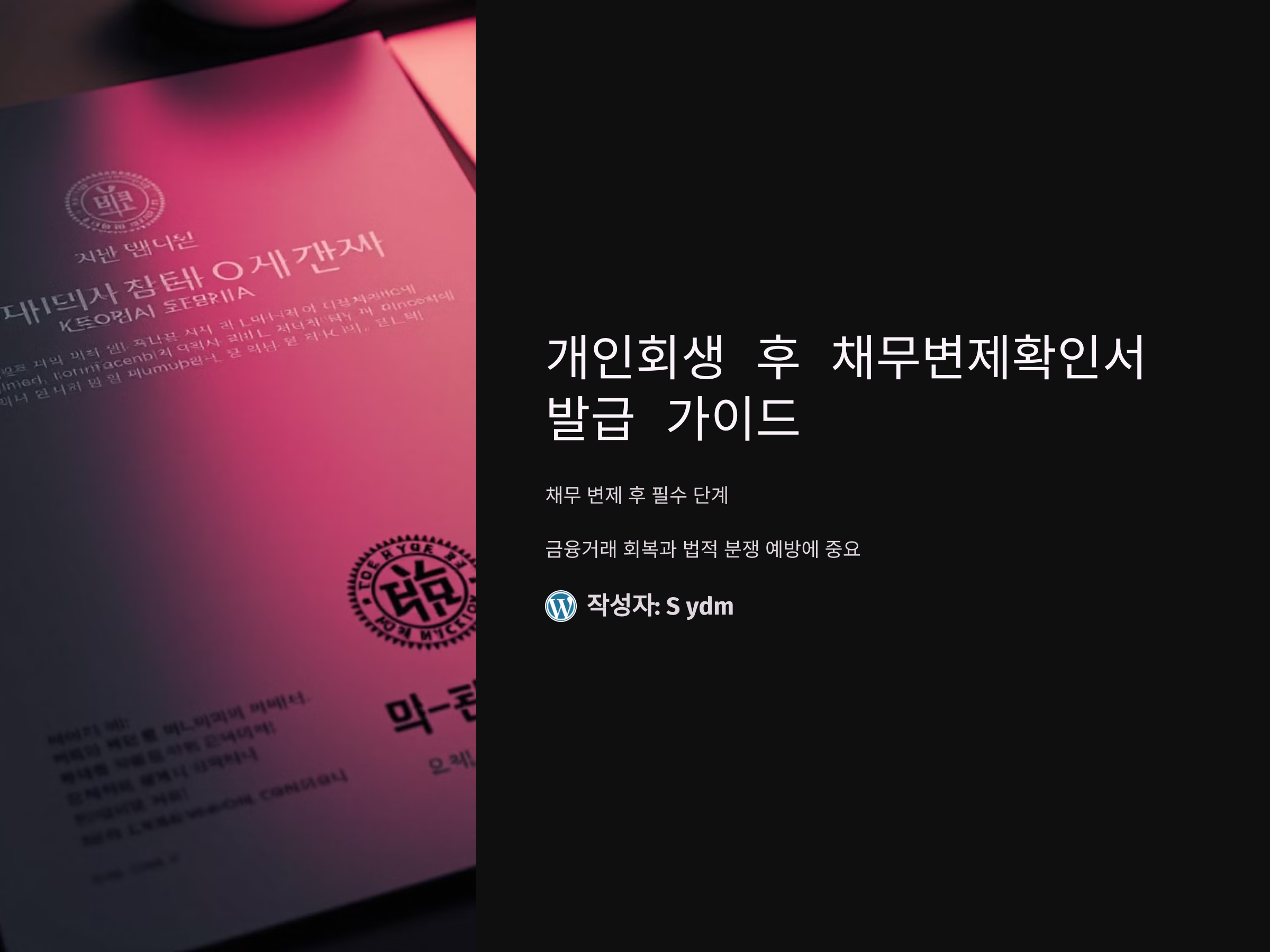 개인회생을 통해 채무를 모두 변제한 뒤에는 '채무변제확인서'를 반드시 발급받아야 합니다. 이 문서는 금융거래 회복이나 법적 분쟁을 예방하는 데 중요한 역할을 하며, 추후 발생할 수 있는 채권 문제를 방지하는 중요한 서류입니다.