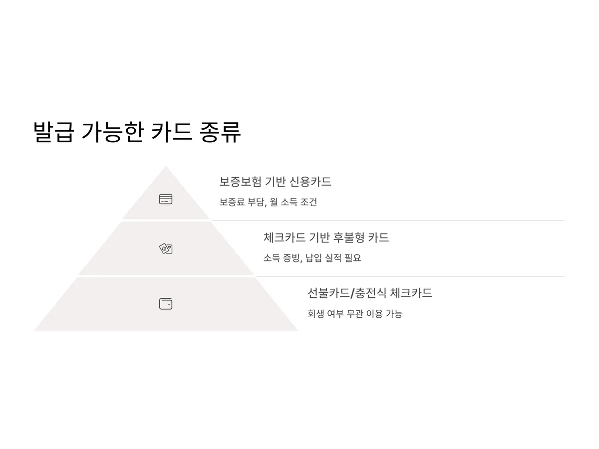 개인회생자에게 발급 가능한 카드는 대체로 크게 세 가지로 나눌 수 있습니다. 첫째는 ‘선불카드’ 혹은 충전식 체크카드로, 일반적인 사용에 제한이 없으며 회생 여부와 무관하게 이용이 가능합니다. 둘째는 일정 소득 증빙과 납입 실적이 인정될 경우 발급 가능한 ‘체크카드 기반 후불형 카드’입니다. 이는 유사 신용 기능을 가지며, 한도는 낮지만 할부 기능이 일부 포함됩니다.