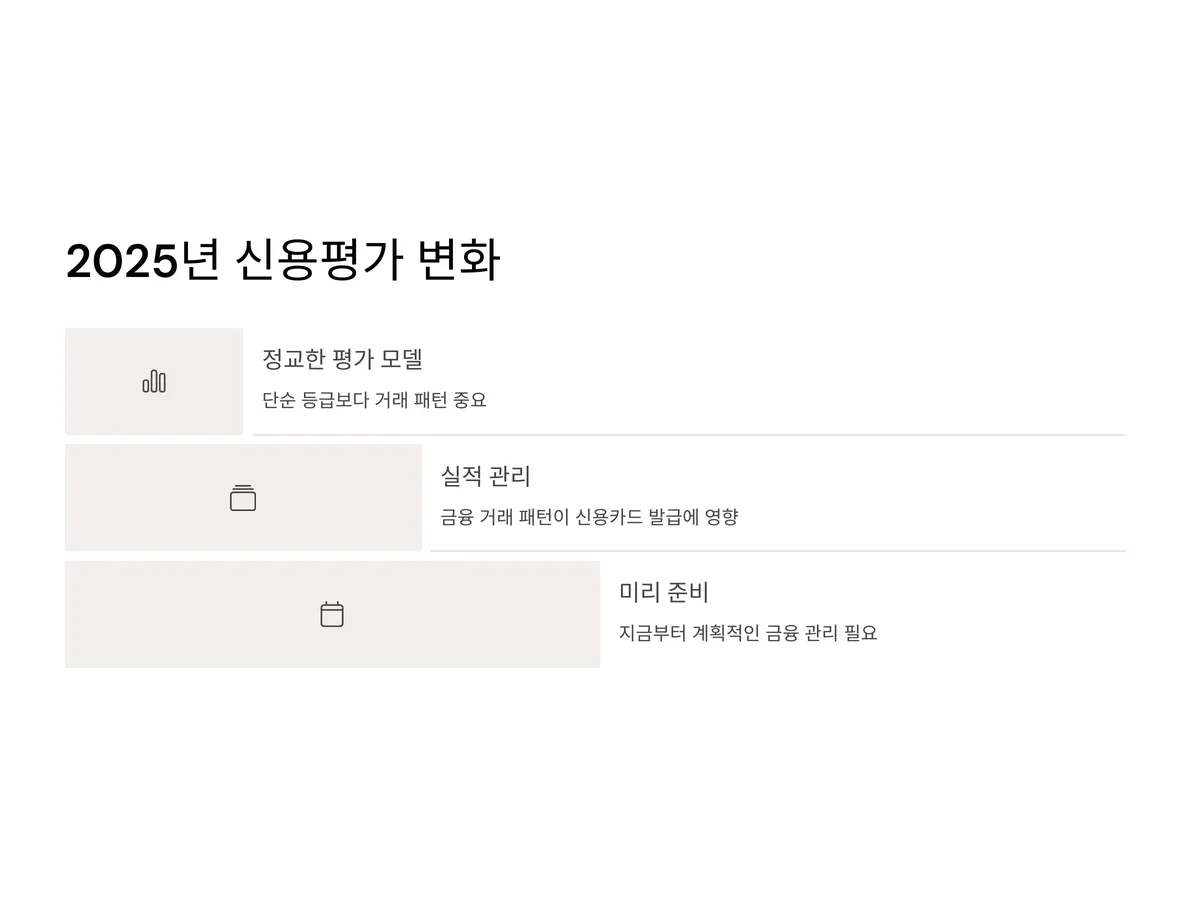 특히 금융권의 '개인신용평가 모델'이 2025년부터 더 정교해지면서, 단순 등급보다는 실제 금융 거래 패턴을 더욱 중요하게 반영하기 때문에, 실적 관리만 잘해도 신용카드 발급으로 이어질 수 있습니다. 향후를 위해 지금부터 준비해야 할 항목들을 구체적으로 계획해 두는 것이 좋습니