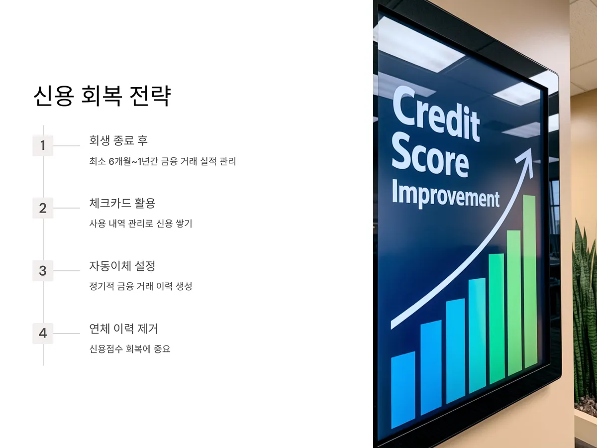 개인회생 완료 후 일정 기간이 지나면, 일반 신용카드 발급도 가능해집니다. 이때 가장 중요한 것은 회생 종료 후 최소 6개월~1년간 ‘금융 거래 실적’을 잘 쌓는 것입니다. 체크카드 사용 내역, 자동이체 이력, 금융 연체 이력 제거 등은 신용점수 회복에 매우 중요하게 작용합니다.