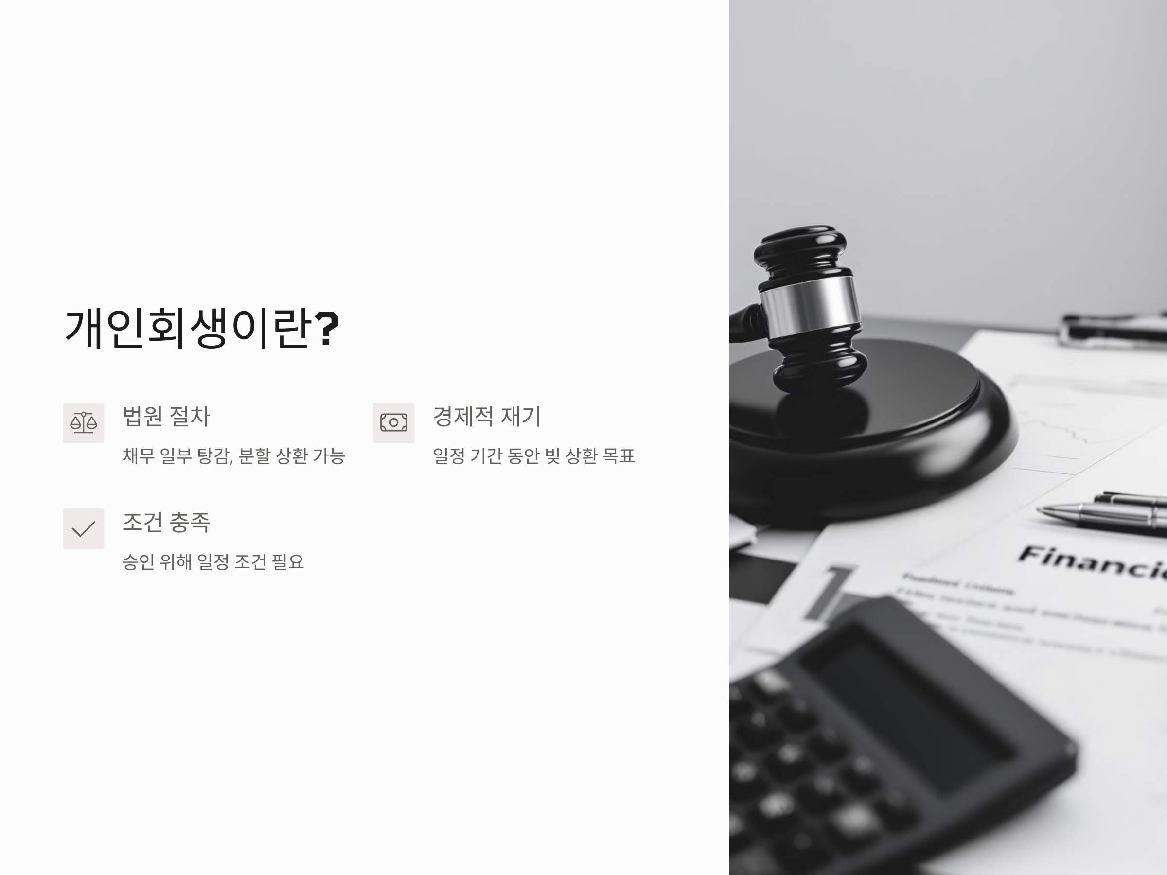 개인회생은 경제적인 어려움에 처한 사람들이 법원에 의해 일정한 기간 동안 채무를 일부 탕감받고, 남은 채무를 분할해서 갚을 수 있도록 돕는 제도입니다. 하지만 모든 신청자가 이 절차를 통해 채무를 탕감받을 수 있는 것은 아닙니다. 개인회생이 승인되기 위해서는 일정한 조건을 충족해야 하며, 이 조건을 충족하지 못하면 기각될 수 있습니다.
