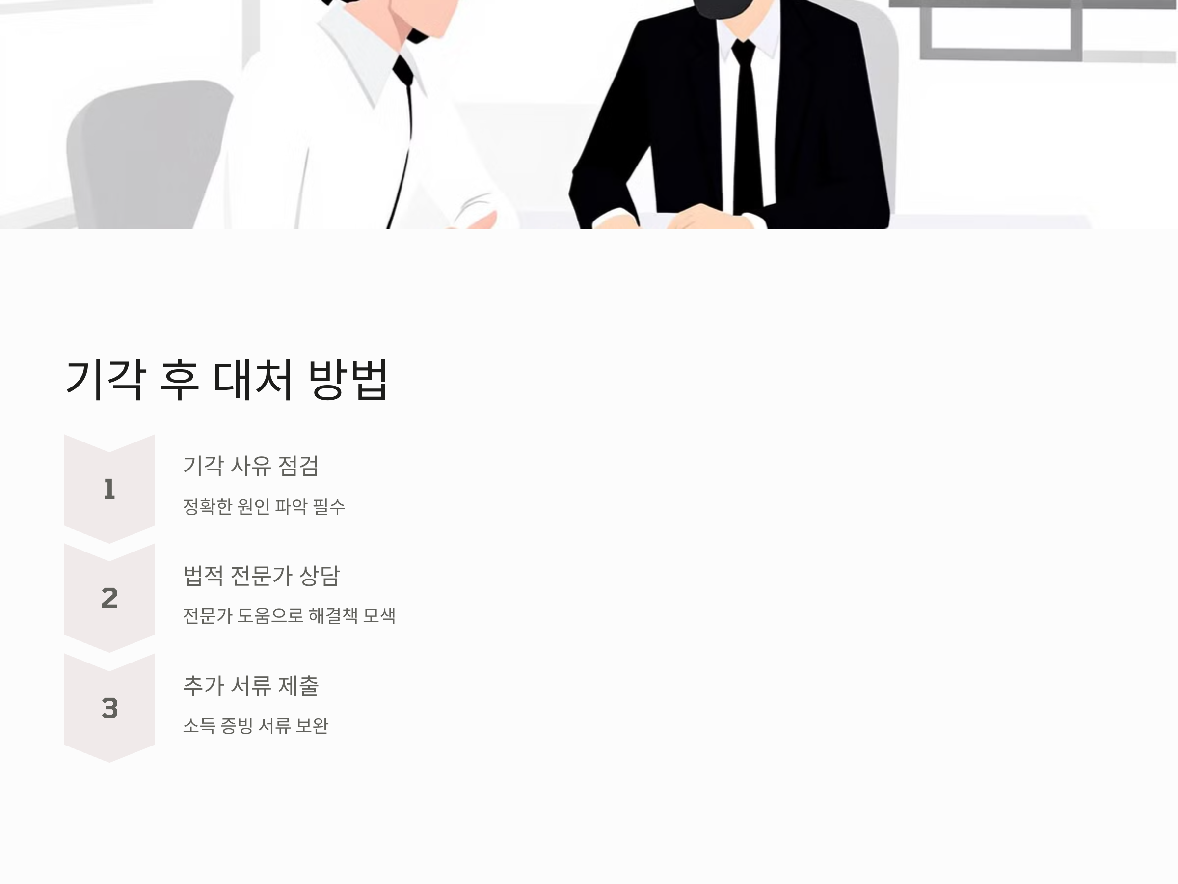 첫 번째 기각의 사유를 정확히 파악하고, 이를 수정하지 않으면 두 번째 기각을 피할 수 없습니다. 예를 들어, 첫 번째 기각 사유가 소득 증빙 부족이라면, 이에 대해 충분한 서류를 준비하여 재신청해야 합니다.