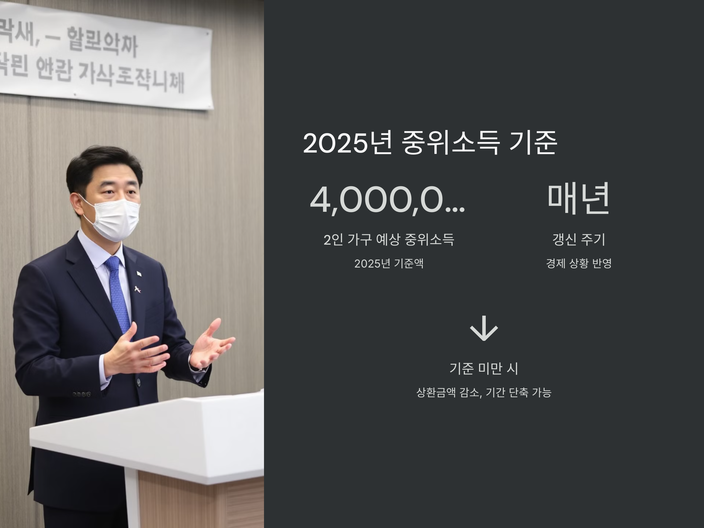 2025년의 기준을 보면, 2인 가구의 중위소득이 약 4,000,000원으로 예상됩니다. 이 금액은 정부에서 제시하는 기준에 따라 상환 기간과 상환 금액을 정하는 데 중요한 역할을 합니다. 만약 2인 가족의 월소득이 이 기준보다 낮으면, 상환 금액이 줄어들거나 상환 기간이 단축될 수 있습니다.