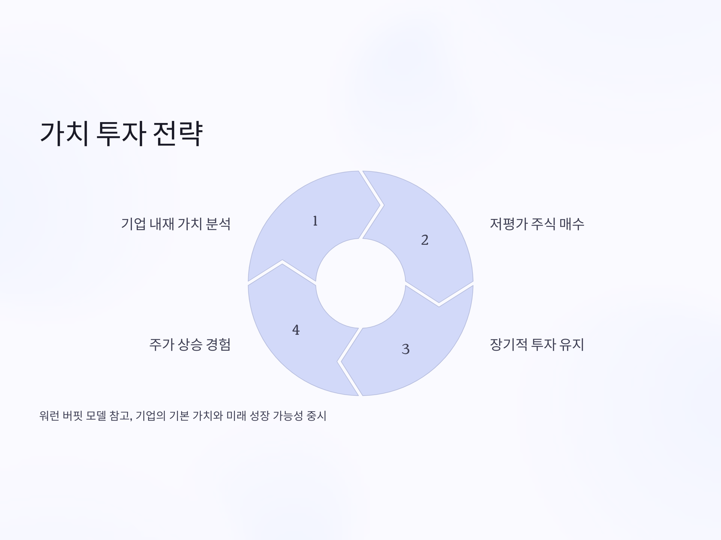 가치 투자(Value Investing)는 장기적인 안목을 가지고 기업의 내재 가치를 분석하여 저평가된 주식을 매수하는 전략입니다. 유명한 가치 투자자인 워런 버핏(Warren Buffett)을 모델로 삼아, 많은 개인 투자자들이 이 전략을 통해 성공을 거두었습니다.
