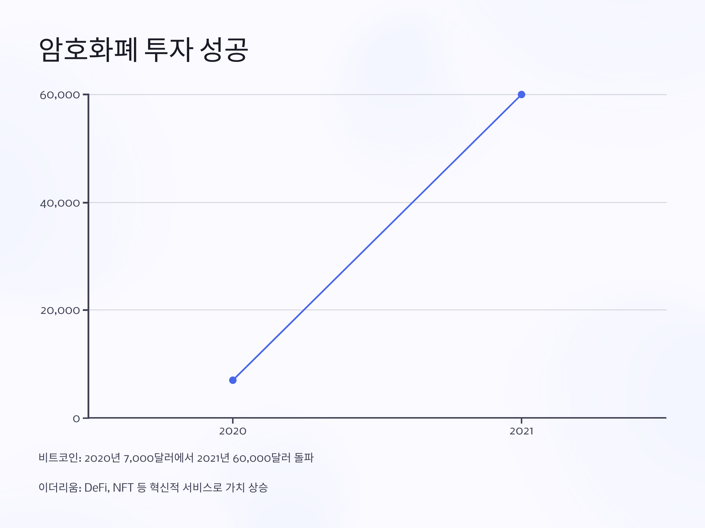 2020년 초, 비트코인의 가격은 약 7,000달러였고, 2021년 말에는 60,000달러를 돌파하는 등 큰 상승세를 보였습니다. 비트코인의 상승을 예측하고 초기에 매수한 투자자들은 큰 수익을 올렸습니다. 또한, 이더리움의 경우, 디파이(DeFi)와 NFT 등의 혁신적인 서비스가 등장하면서 더욱 가치가 상승하였고, 이와 관련된 프로젝트에 투자한 개인 투자자들도 높은 수익을 경험했습니다.