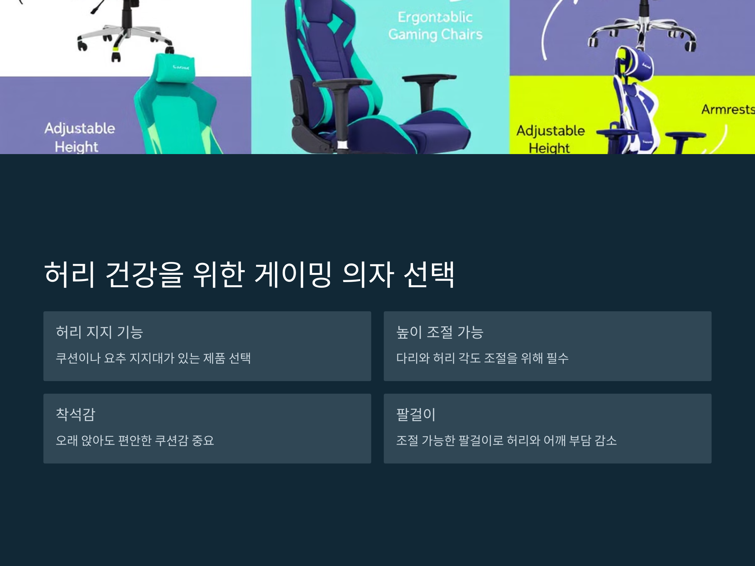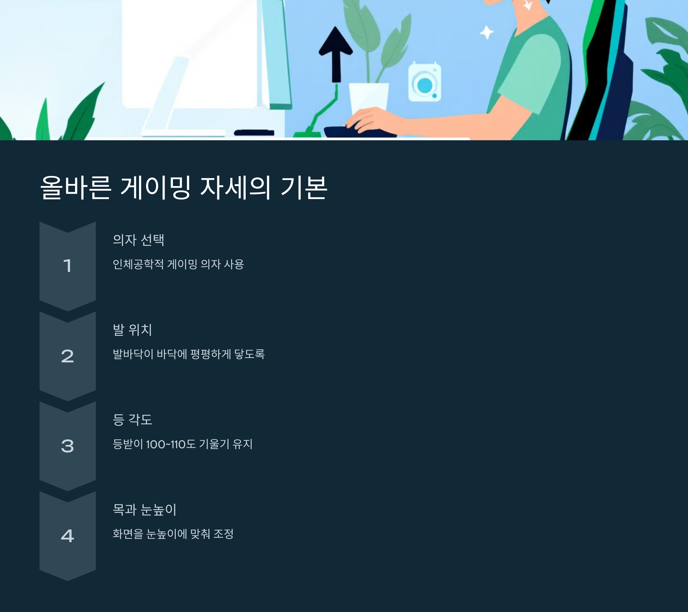- 의자 선택: 허리를 잘 받쳐주는 인체공학적 게이밍 의자를 사용하세요.