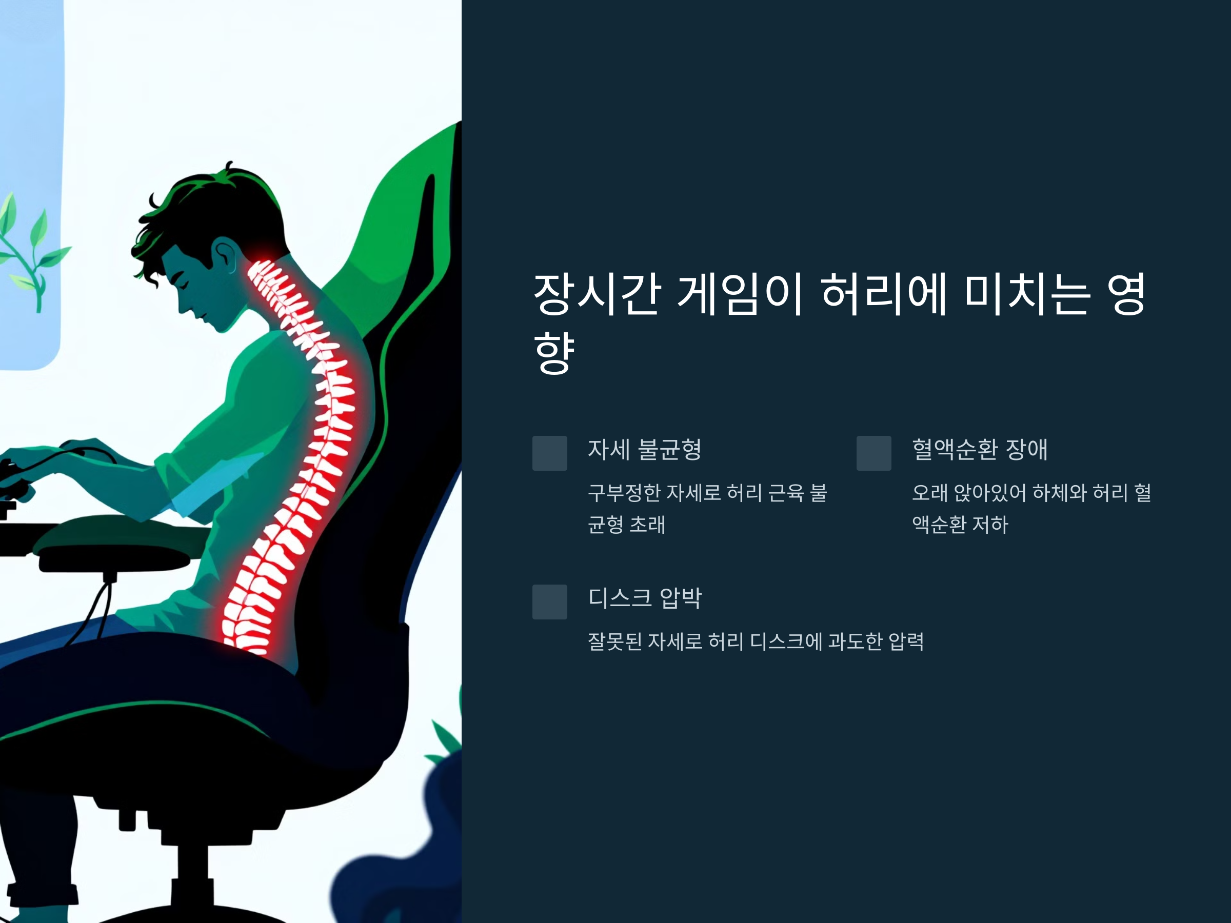 게임을 즐길 때 허리에 어떤 영향을 미치는지 알고 계시나요? 대부분의 게이머는 장시간 앉은 자세로 게임을 하게 되는데, 이로 인해 허리에 과도한 압력이 가해집니다. 특히 허리를 곧게 펴지 않고 구부정한 자세로 앉으면 요추에 무리가 가해져 통증을 유발할 가능성이 큽니다. 아래는 주요 영향을 정리한 내용입니다.