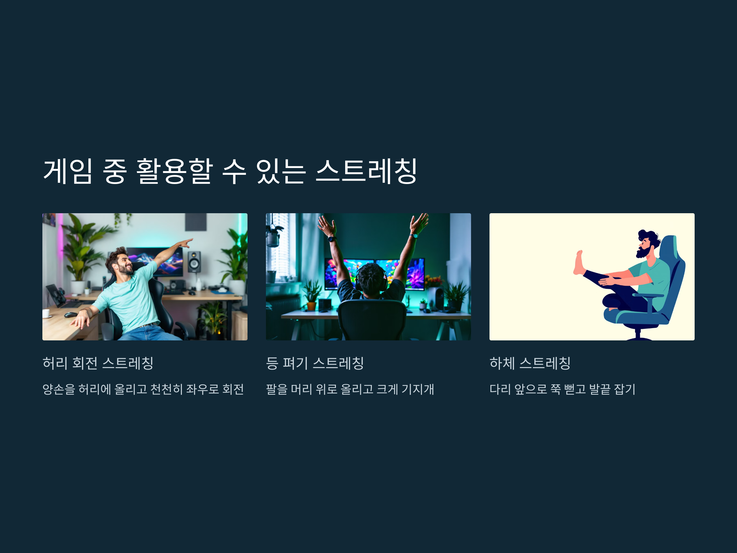 스트레칭은 허리 통증 예방에 효과적인 방법입니다. 게임 중간중간 간단한 스트레칭을 통해 근육을 풀어주는 습관을 가지세요. 아래는 누구나 따라 하기 쉬운 스트레칭 동작입니다.