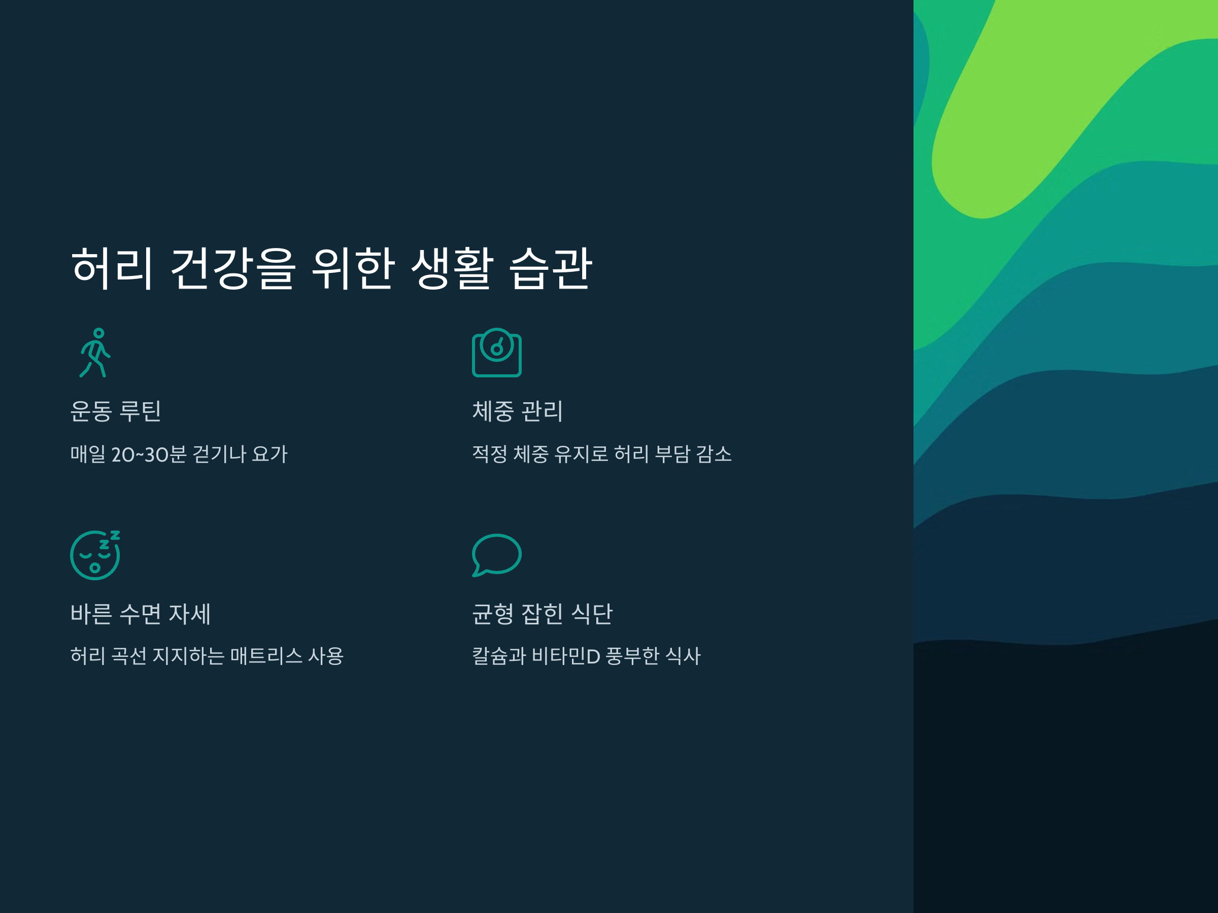 이 습관들은 허리 건강을 장기적으로 유지하는 데 필수적인 요소들입니다.