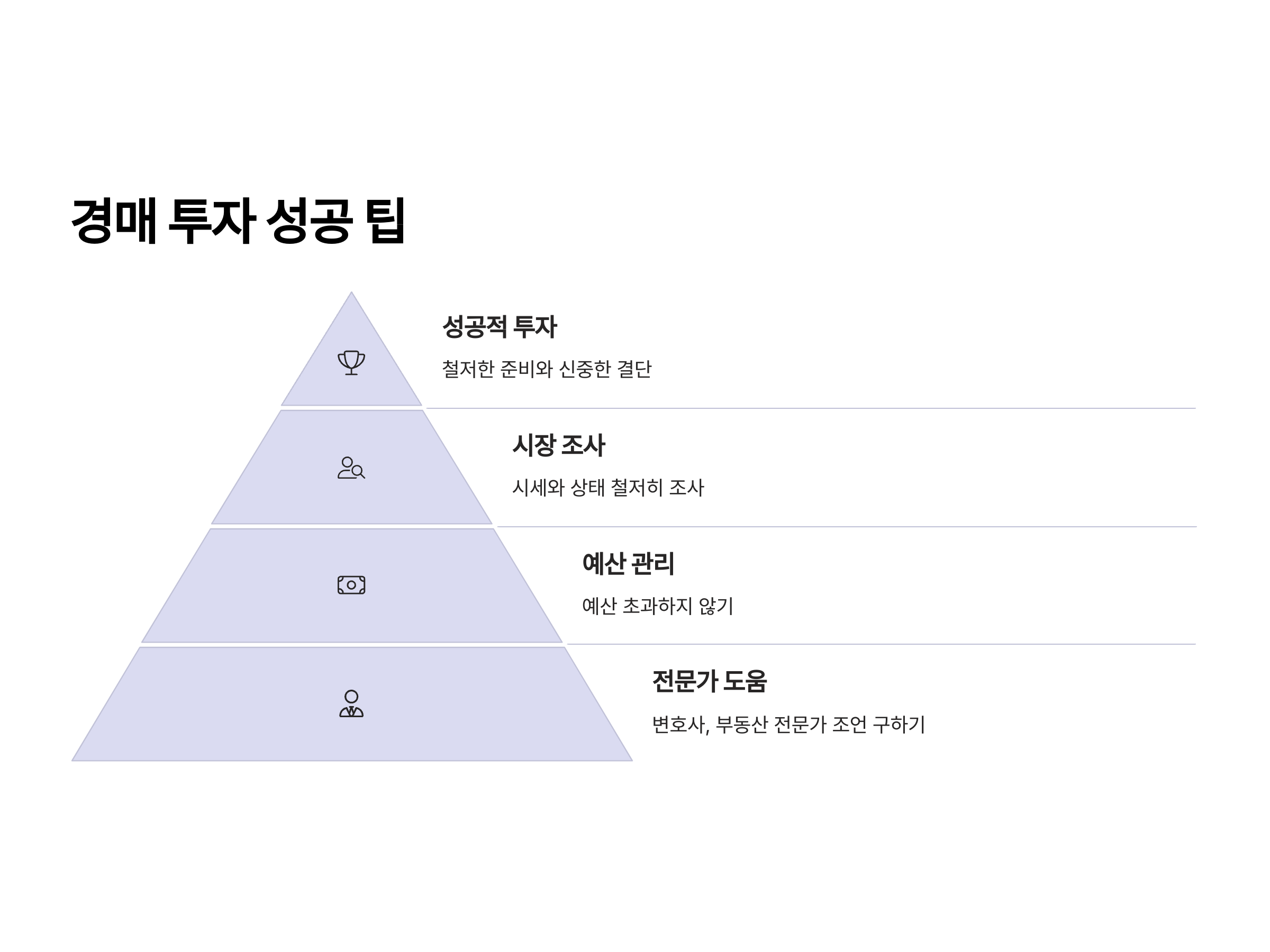 경매 투자에서 성공하기 위해서는 시장 분석, 입찰 전략, 자산 관리 등 여러 가지 요소를 고려해야 합니다. 경매 초보자가 성공적인 경매 투자를 위해 기억해야 할 핵심 팁은 다음과 같습니다.