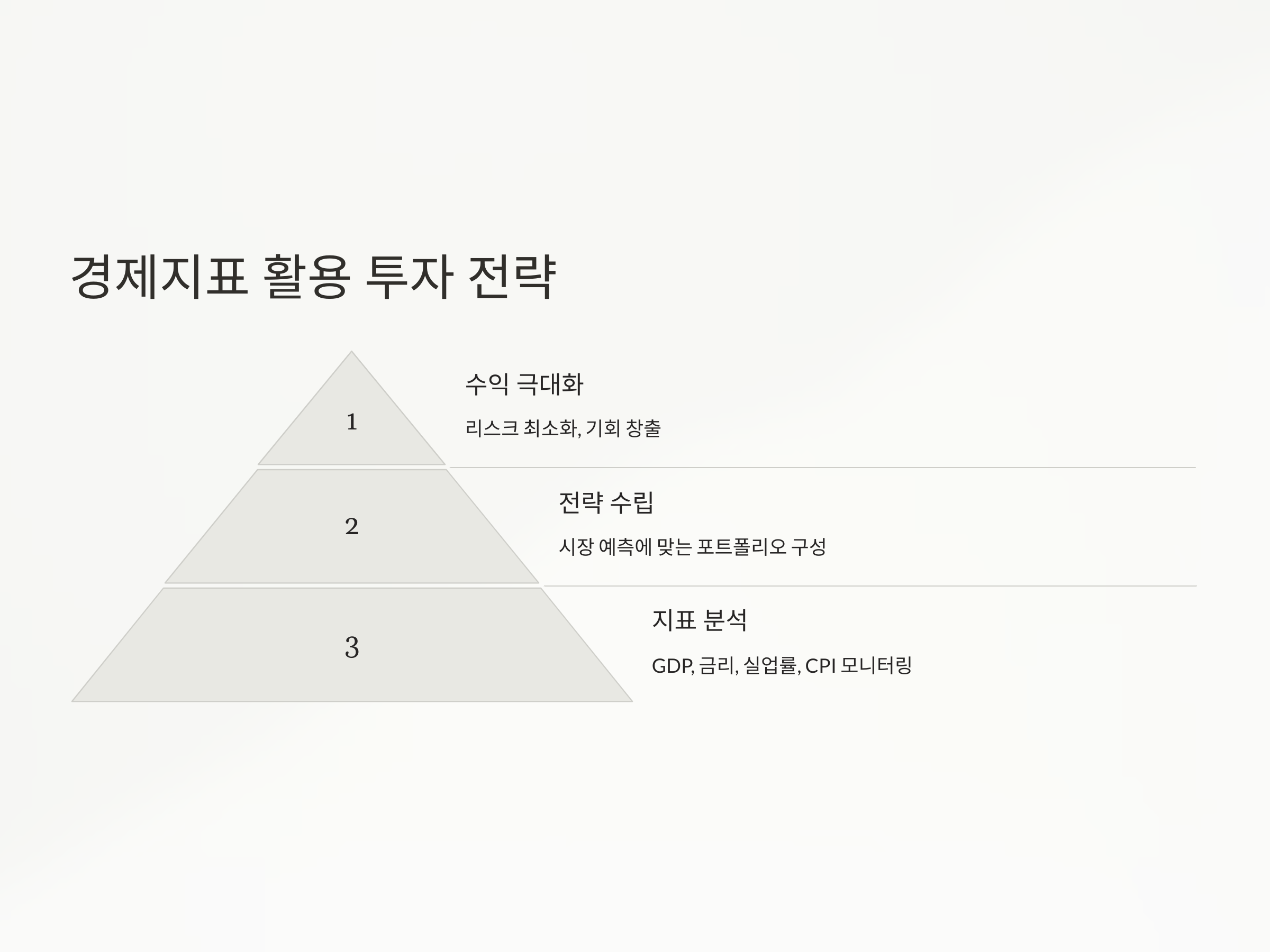 경제지표를 활용한 투자법은 시장의 흐름을 읽고, 이를 바탕으로 전략을 세울 수 있는 매우 중요한 방법입니다. 중요한 경제지표들—GDP, 금리, 실업률, CPI 등—을 주기적으로 모니터링하고, 이들 지표가 시장에 미치는 영향을 분석하는 것이 필요합니다. 또한, 각 경제지표는 서로 연결되어 있기 때문에, 단기적인 변화에 휘둘리지 않도록 장기적인 관점에서 종합적인 분석을 하는 것이 중요합니다.