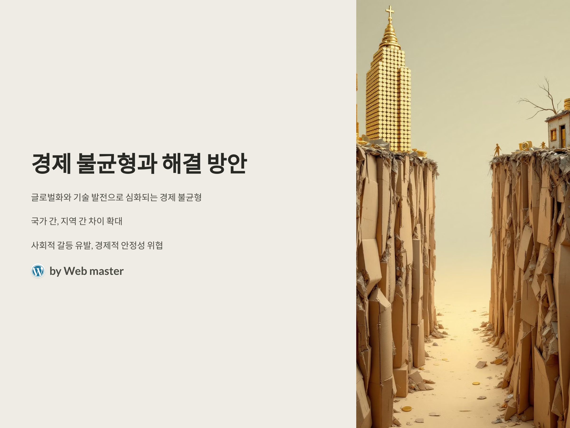 경제 불균형 문제는 단순한 경제적 불평등을 넘어서, 국가와 글로벌 차원에서 중요한 문제로 떠오르고 있습니다. 이를 해결하기 위해서는 정부, 기업, 개인이 각각 중요한 역할을 해야 하며, 각자의 책임을 다해야 합니다. 또한, 글로벌 차원에서의 협력이 강화되어야 하며, 지속 가능한 경제 발전을 위한 정책적 노력이 필요합니다.