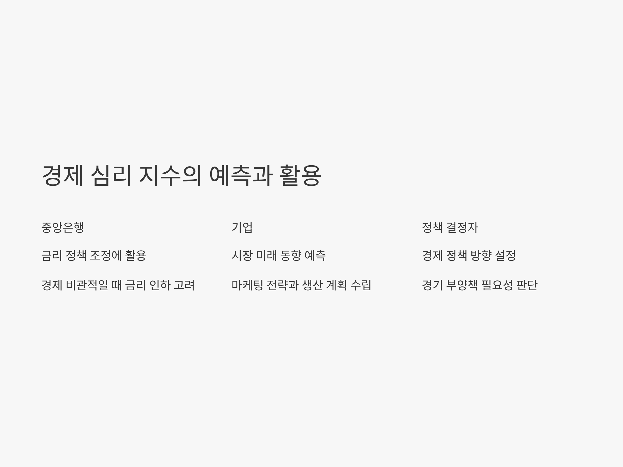 또한, 기업들은 경제 심리 지수를 활용해 시장의 미래 동향을 예측합니다. 소비자들의 심리 변화를 반영한 마케팅 전략을 수립하거나, 생산 계획을 세우는 데 이 지수를 적극적으로 활용합니다. 이는 기업들의 경쟁력을 높이는 데 중요한 역할을 합니다.