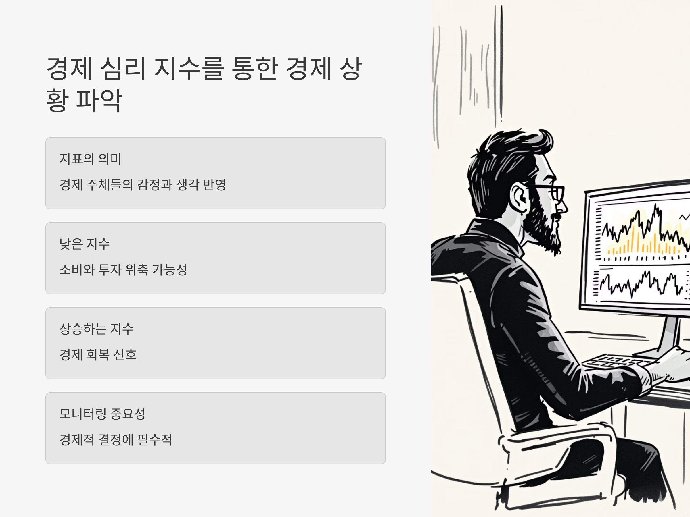 경제 심리 지수는 단순한 통계 수치가 아니라, 경제 주체들의 감정과 생각을 반영하는 중요한 지표입니다. 이 지수의 변화를 통해 우리는 경제의 흐름을 예측하고, 개인이나 기업이 취해야 할 전략을 세울 수 있습니다. 경제 심리 지수가 낮다면, 소비와 투자가 위축될 가능성이 크고, 반대로 이 지수가 상승하면 경제는 점차 회복될 가능성이 큽니다.