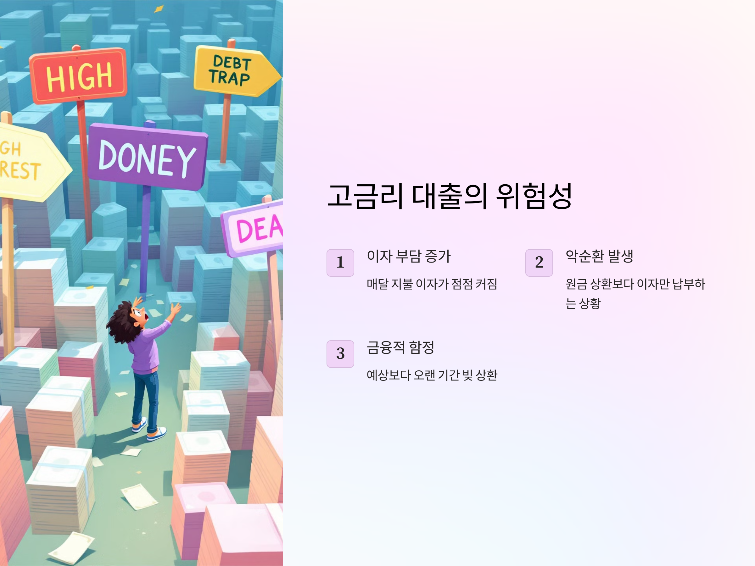 따라서 고금리 대출은 일종의 금융적 함정이 될 수 있습니다. 이를 해결하지 않으면 재정적 어려움은 점차 심화될 수 있으므로, 가능한 한 빨리 탈출 전략을 세우는 것이 중요합니다.