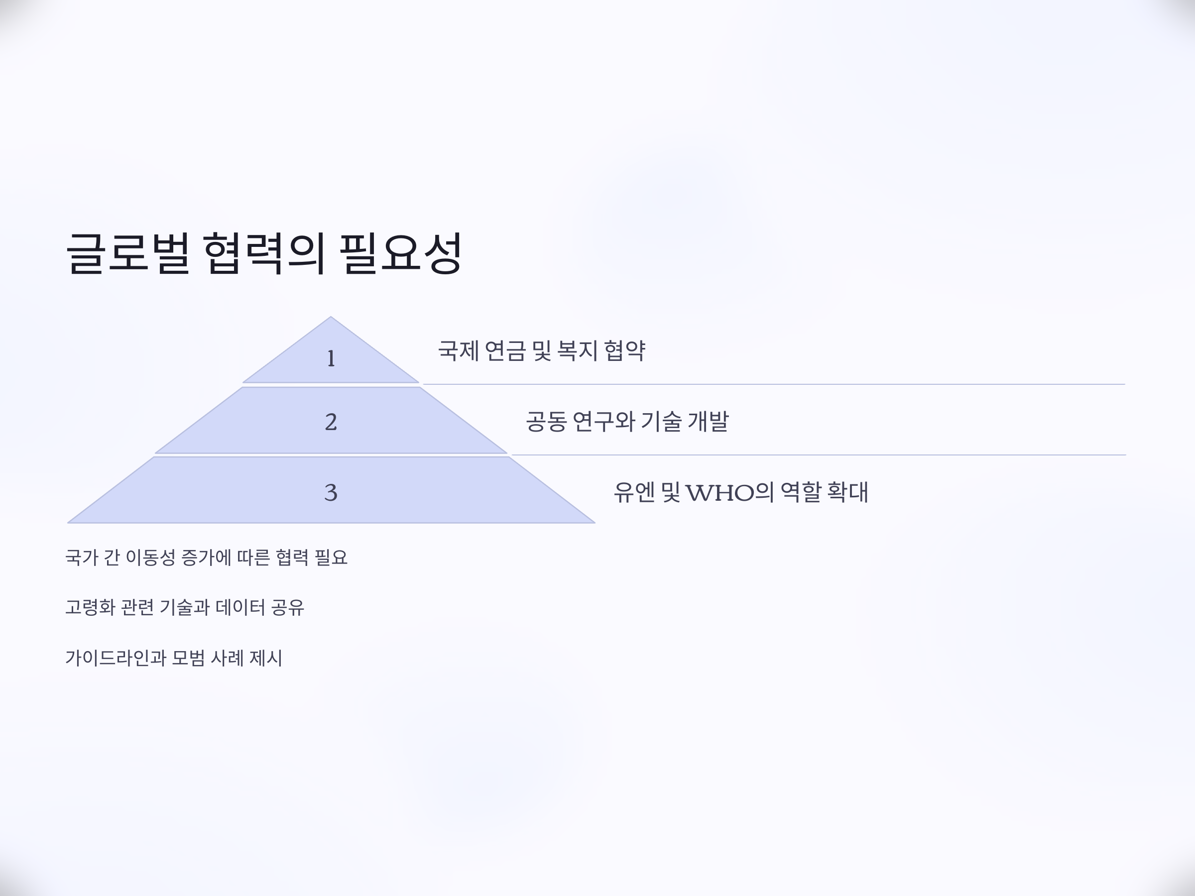 고령화는 국가 간 협력을 통해 보다 효과적으로 대응할 수 있습니다. 글로벌 차원에서 다음과 같은 정책이 요구됩니다.