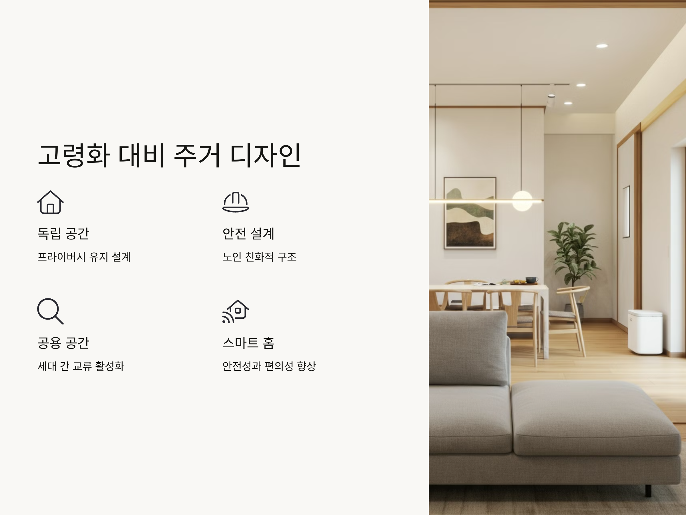 - 기술 융합 주거: 스마트 홈 기술이 고령자의 생활 편의성과 안전을 보장.