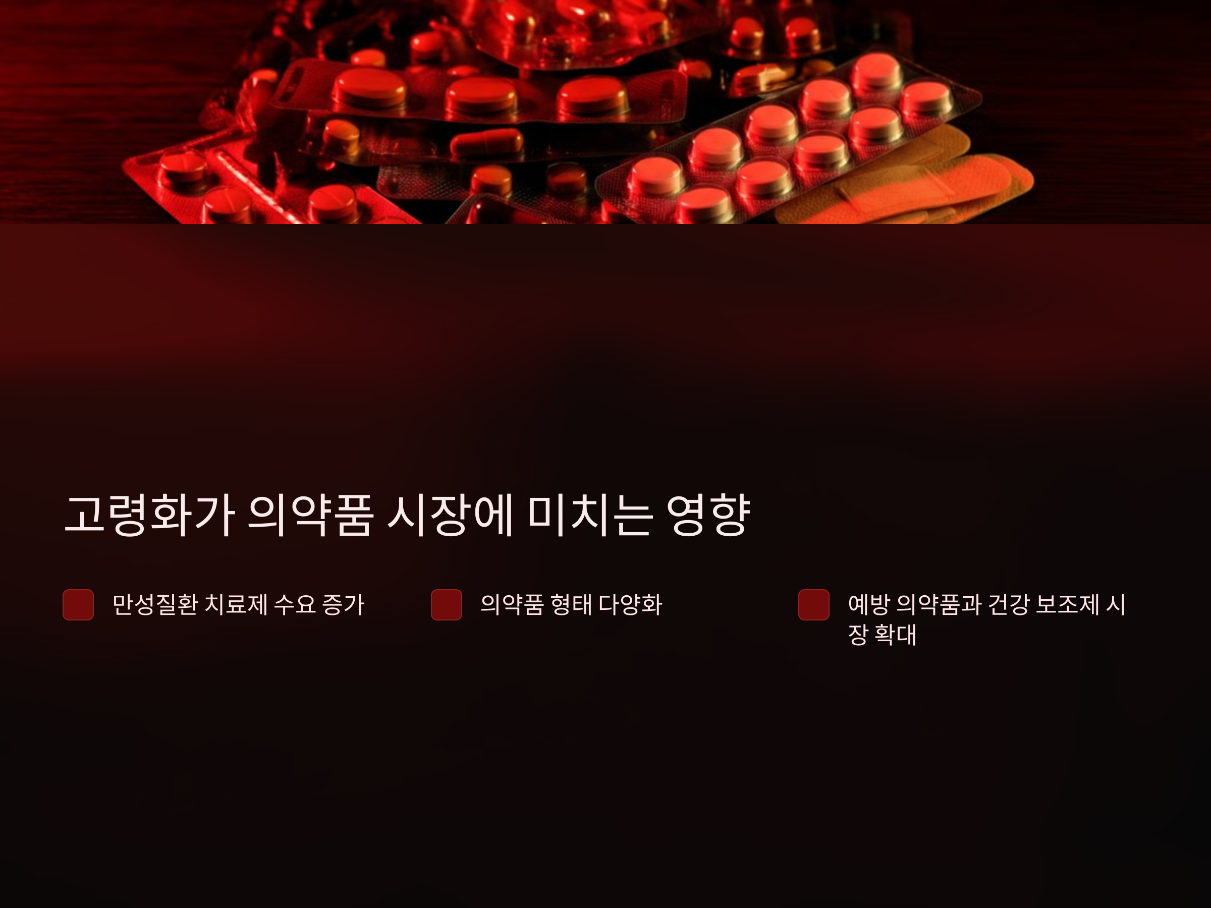 고령 인구가 증가함에 따라 의약품 시장의 수요는 양적, 질적으로 변화하고 있습니다. 고령층은 만성질환의 유병률이 높아 약물 치료의 의존도가 상대적으로 크며, 이는 의약품 개발과 판매의 중심 축이 변하고 있음을 나타냅니다. 주요 변화는 다음과 같습니다.