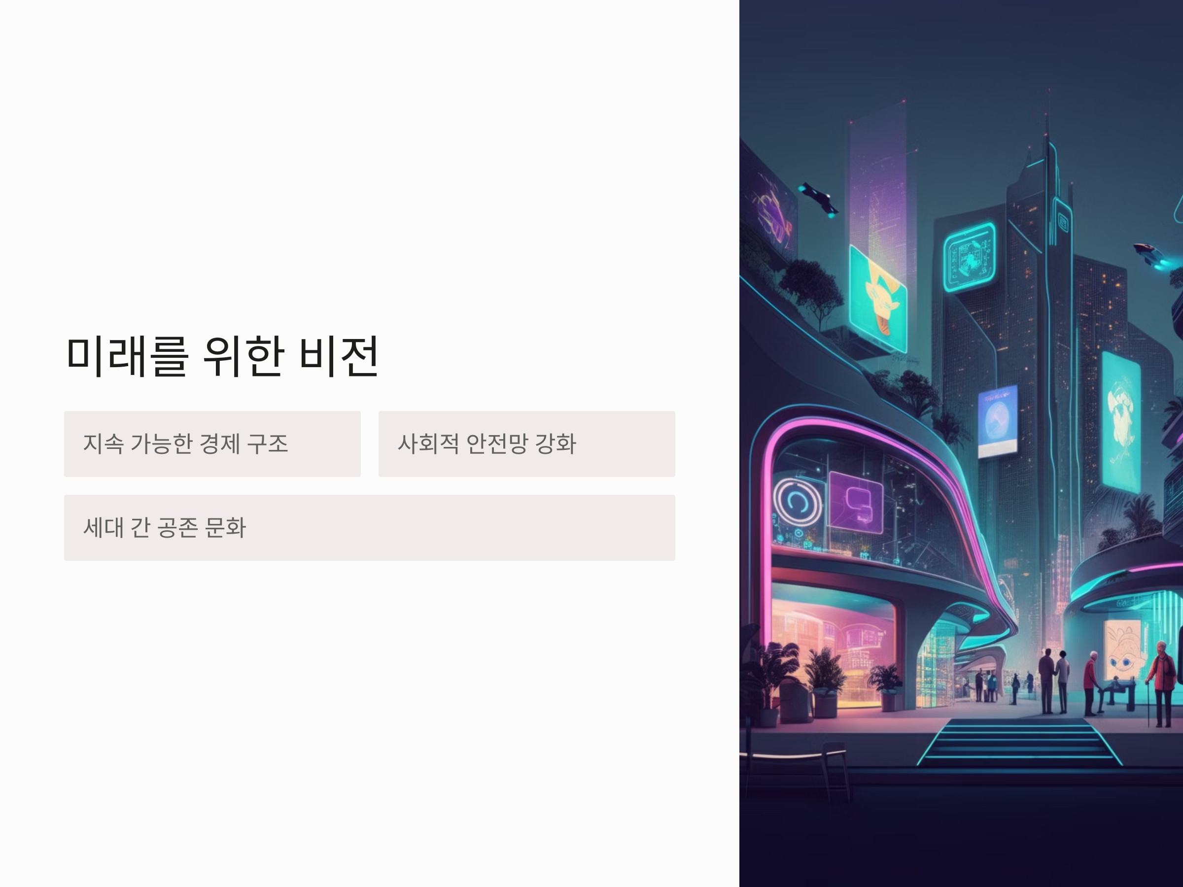 - 사회적 안전망 강화: 누구도 소외되지 않는 복지 체계 마련.