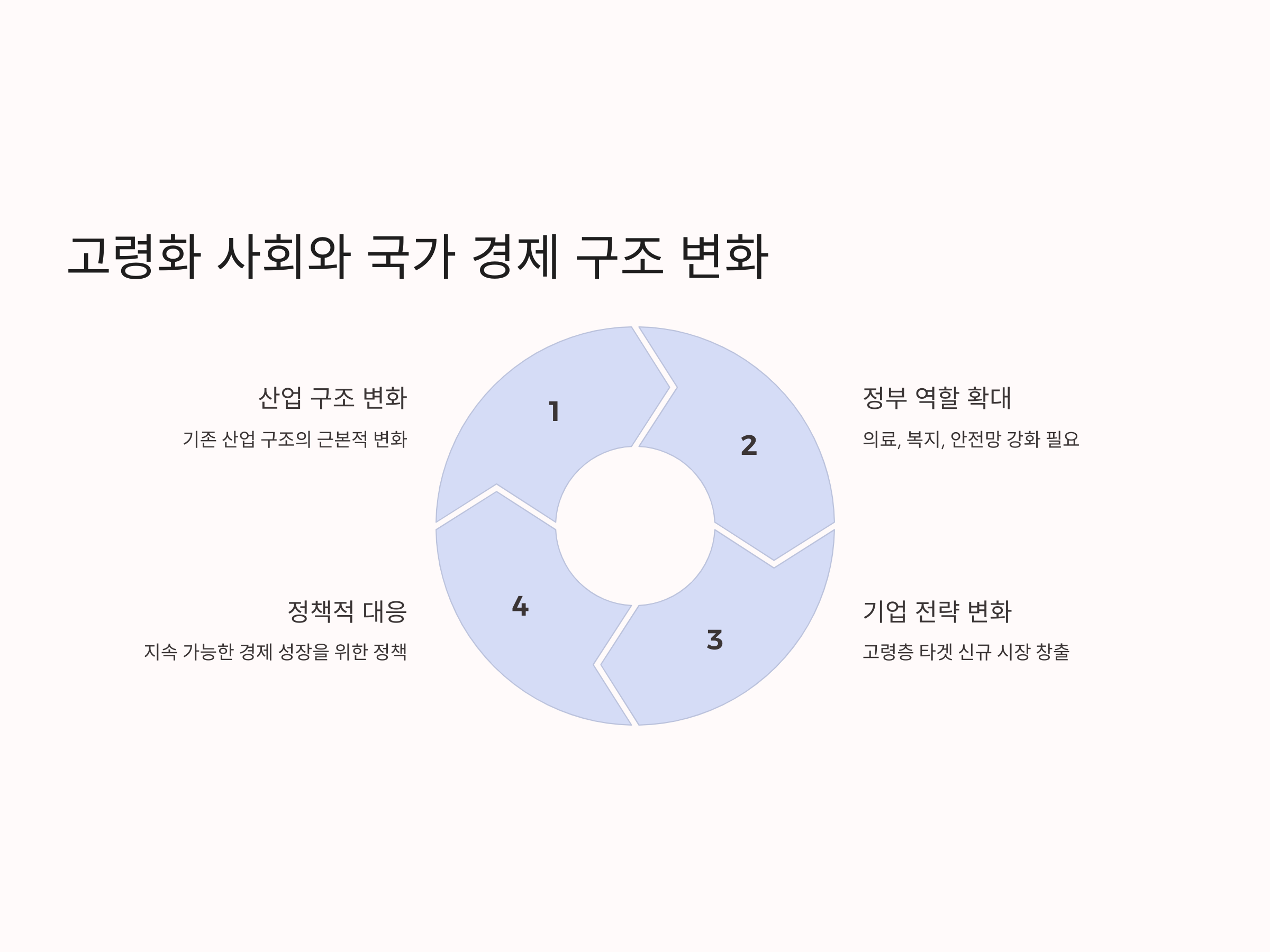 고령화 사회는 국가 경제 구조에 근본적인 변화를 가져옵니다. 특히 고령 인구가 증가함에 따라, 기존의 산업 구조와 노동 시장의 변화가 일어나게 됩니다. 국가 경제는 이제 단순히 생산과 소비의 선순환만으로 유지될 수 없으며, 고령화 사회를 대비한 새로운 경제 구조로의 전환이 필요합니다.