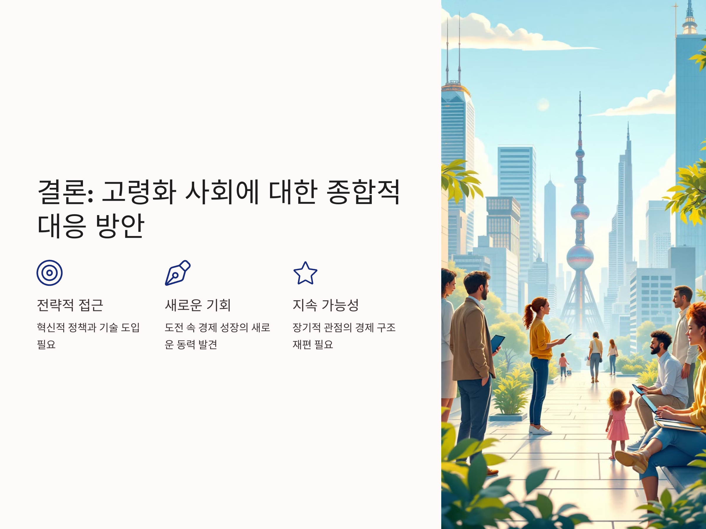 예를 들어, 정부는 고령 인구를 위한 의료, 복지, 안전망 등을 강화해야 하며, 기업들은 고령층을 타겟으로 한 새로운 시장을 창출해야 합니다. 또한, 지속 가능한 경제 성장을 위해 고령화 사회에서 발생할 수 있는 여러 문제들을 해결할 수 있는 정책적 대응이 필요합니다.
