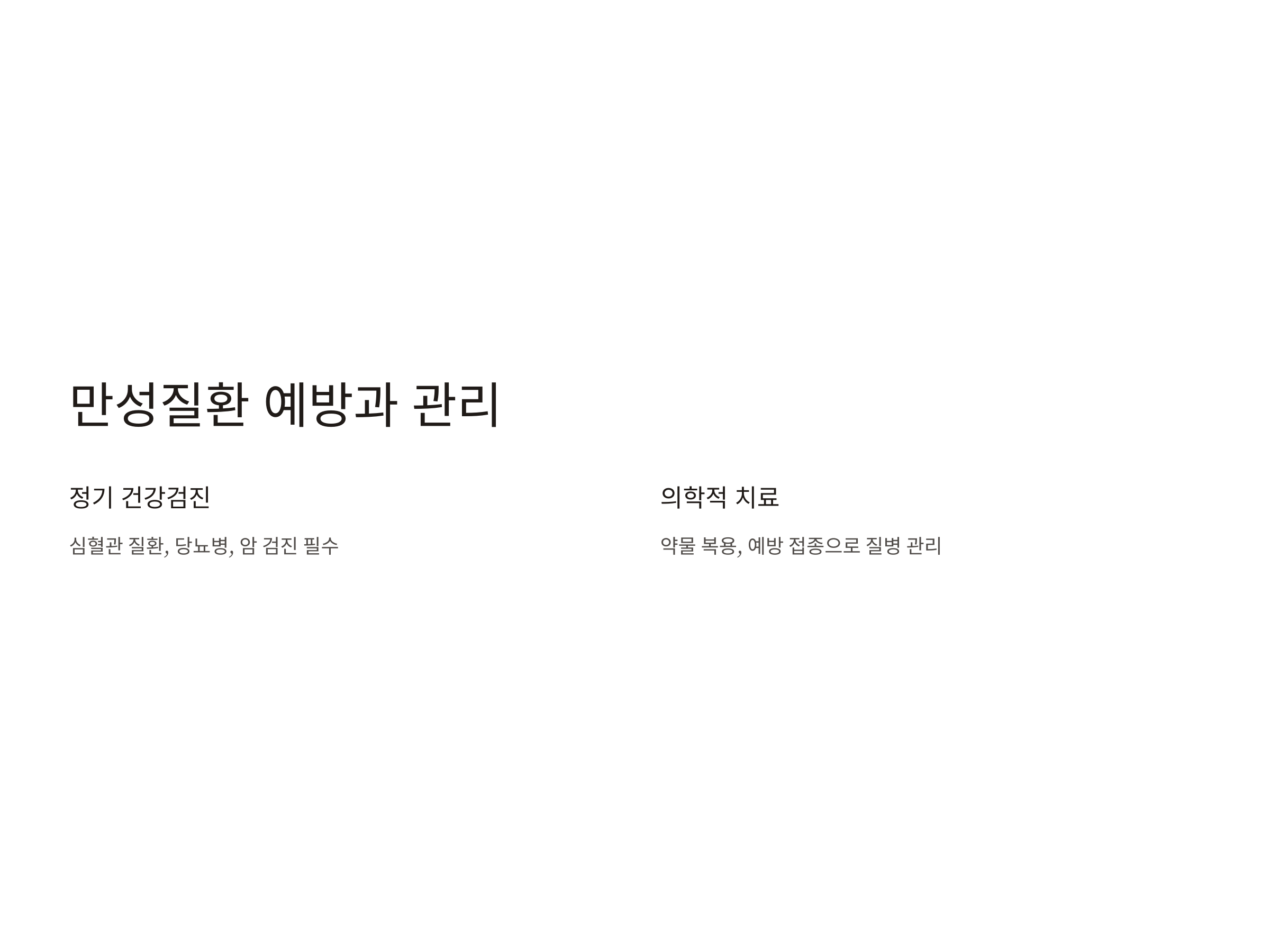 정기적으로 건강검진을 받아 초기 단계에서 질병을 발견하면 치료가 훨씬 수월합니다. 특히 심혈관 질환, 당뇨병, 암 검진은 필수입니다.