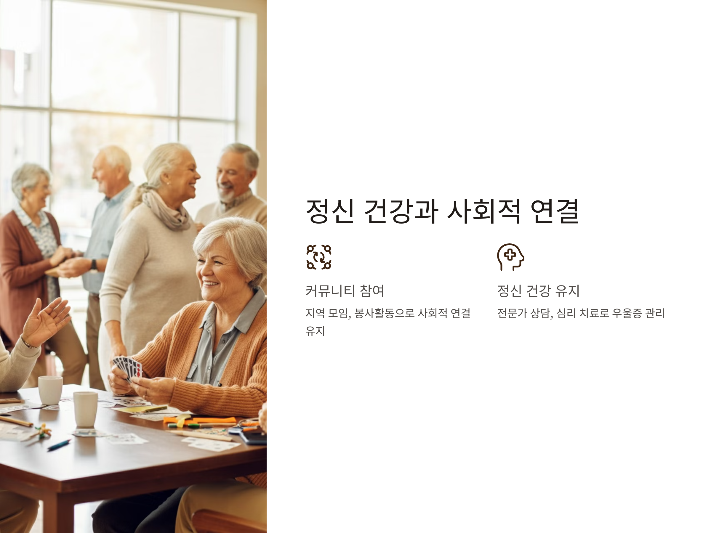 사회적 고립은 노년기 건강에 큰 영향을 미칩니다. 활발한 사회적 활동과 정신 건강 관리가 중요합니다.